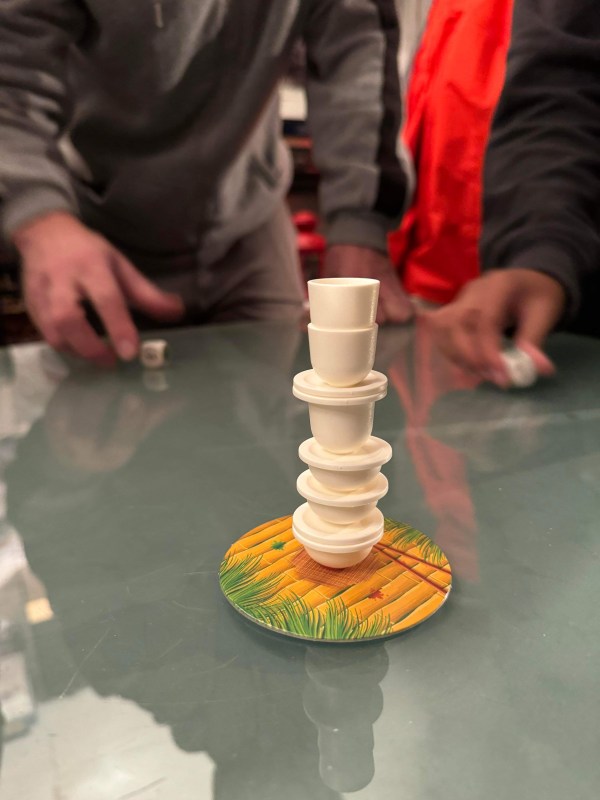 Brettspillhungeren i PG gjorde at 8 spillere dukket opp denne mandagen, med Melanie som ny og forhåpentligvis ikke avskremt spiller etter en kveld i Grotten. Sveinmain hadde vært på Gjenbruken på Jørpeland, svidd av kr 15,- og handlet inn Paku Paku. Spillet takler hele 8 spillere og er egentlig et stressespill. Kast en terning, enten kast den en gang til, sendt den videre eller bygg tallerkner/kopper/glass oppå hverandre i midten. Ender du opp med 3 terninger, eller velter koppene i midten så vanker det minuspoeng – kanskje. Sa jeg at vi alle var tykke pandaer på en konvention i tillegg, så har du spillet.