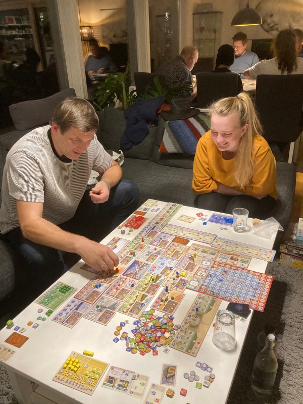 Hovedrett B: På 4er bordet ble det en ren revansje fra 2 uker tilbake. Øystein, Maja, Saulius og Sveinmain ville alle en tur til Yokohama, og da alle hadde vært der nylig trengte en nesten ikke å forklare reglene igjen. Deilig å kunne gå rett på et spill. Varer skulle hentes inn og ordrer skulle fullføres. Det ble igjen et race for å få levert 4 kasser til handelshuset som gir 22 poeng. Sveinmain klarte det først igjen, mens Maja og Saulius kom rett etterpå til færre poeng.