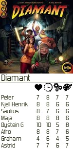 Som så ofte før i diamant så er det noen som har skrinn lyd i kista si, mens andre smiler mer og har god kistelyd full av diamanter. Saulius var vel den som hadde gått på flest smeller. Men i siste runde sprang den ene etter den andre ut av gruva og han sto igjen alene. Flere og flere diamanter dukket opp, og på 25 så feiget han ut, men holdt det til seier? Peter kunne vise frem 30 diamanter, Kjell Henrik 29, så kom Saulius på en god 3. plass med 28 totalt. Så fulgte resten – dvs. Maja, Øystein, Astrid, Afro og til slutt Graham som selvsagt likte spillet minst. For alle andre var det stort sett tommel opp!