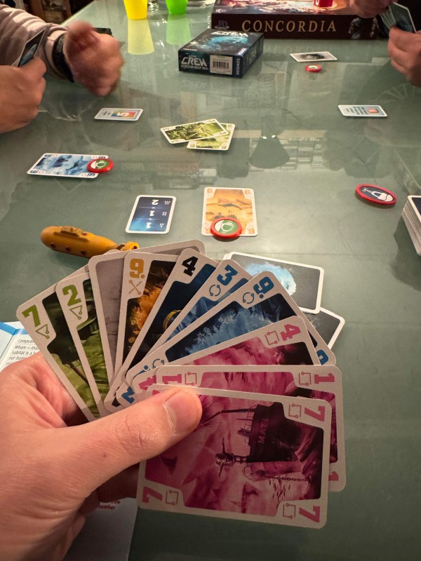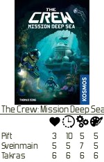 Graham og Peter dro hjem og Takras tok frem The Crew, et samarbeidsspill med ta stikk-mekanisme. Samarbeidsspill er sjelden en schlager i PG, men var dette et unntak? Reglene var temmelig enkle. Vi velger ca ett oppdrag hver som hver spiller får. Så skal du klare oppdraget mens du spiller noe som ligner «Amerikaner», bortsett fra at du ikke skal vinne. Enkelte ganger klarte vi oppdraget raskt og slapp å spille runden ut. Andre ganger så visste vi at vi hadde tapt, men måtte like vel spille runden ut for sjansen for at vi kunne klare det var like sannsynlig som at det skulle bli fred i midtøsten.