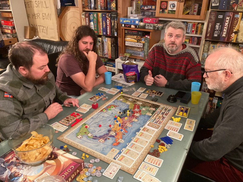 Alle skjønte vel sånn delvis hva som var lurt når vi startet. Her skulle vi reise rundt i Italia, enten med båt eller til fots. Så skulle vi hente inn ressurser og kjøpe kort som igjen gir seierspoeng. Ingen kort ingen poeng, men det koster. Peter satset på det dyreste råstoffet Silke, mens vi andre satset mer variert. Men om silke var dyrt, så kunne det også selges og gi inntekter. Og Peter ble den rikeste mannen i Concordia. Penger er ikke alt, men gir muligheter til å bygge. Alle untatt Peter så hvilken vei det bar, og prøvde å lokke han til å komme seg hjem. Skulle ikke han gå klokken 22? Det var i allefall det som var annonsert. Men lukter du gull, så er det ingen grunn til å sove, rekke fly eller andre hjemlige aktiviteter. For en brettspiller er det kun seier som teller, og seier ble det. Den nærmeste denne mandagen ble Takras, etterfulgt av Graham, Sveinmain og Pift.