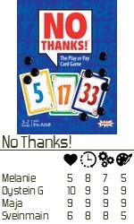 Folk var litt på vei hjem, da No Thanks dukket opp på bordet. Alle har selvsagt tid til det. Melanie skjønt lite til å begynne med, så kom hun godt inn i det og tok poenget. Det ble vel en av de jevneste No Thanks rundene jeg har spilt. Vinneren(Øystein) med 53 poeng, mens taperen hadde 59. Kjapt og kjekt!