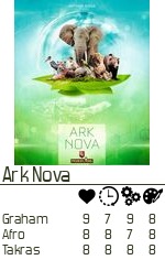Ark Nova dukket opp på det en bordet hvor Takras, Afro og Graham satte seg ned. Det ble mye å tenke på for Afro som ikke hadde spilt det før. Mye kort med tekst og litt regler skulle overvinnes. Men spillet fungerte bra og de ble ferdige etter ca 3 timer + regelforklaring. Hvem som vant, aner jeg ikke, men spillet ble i allefall en vinner:-) Det han være Graham som likte spillet best…