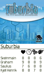 På det andre bordet hadde Graham tatt med seg Suberbia, megabigboxedition – på sykkel. Dermed måtte dette prøves, da han hadde slitt tungt for å få dette frem til sivilisasjonen. Graham satte opp spillet og med litt regelforklaring så var vi i gang. Først skulle to hemmelige mål trekkes, og alle velge en av disse. Saulius, Graham, Kjell Henrik og Sveinmain valgte sine hemmelige goals og dermed var vi i gang. Byene vi bygde hadde både flyplass og tårn, i tillegg til parker og industri. Noen gav inntekter og andre gav fame. Så gjaldt det å balansere det og slå om underveis fra inntekt til poeng(fame). Saulius slet med inntekt, mens Graham hadde masse inntekt, men ikke mye fame. Sveinmain hadde litt av alt, og Kjell Henrik fikk også i gang inntektene sine, men litt sent. Så til poeng og bonusutbetalinger. Graham klarte sitt hemmelige mål, og fikk 15 poeng, og Salulius var klar til å innkassere 20 poeng for fewest lakes. Men han hadde flest! Dermed ble det ingen poeng på innsjøer på han. Men han hadde minst penger og fikk litt bonus likevel, nok til å passere Kjell Henrik. Sveinmain og Graham delte førsteplassen på usle 54 poeng. Og Sveinmain vant på tiebraker.