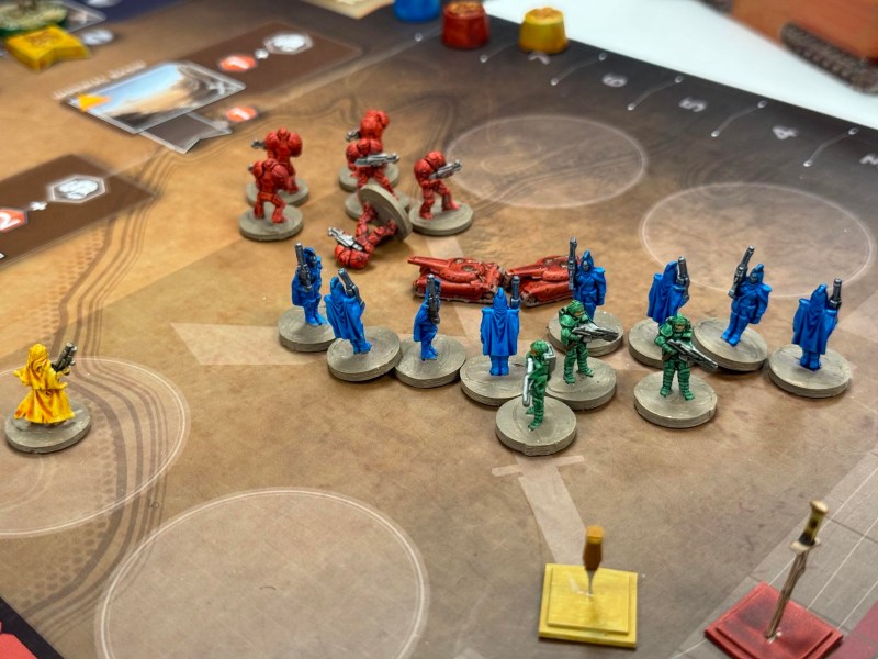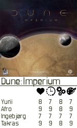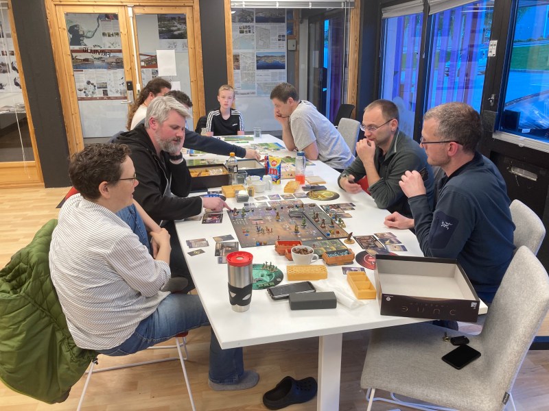 På det andre bordet skulle de fleste gå kl. 22. Og dermed tok Takras frem tungvekteren Dune som inkluderer en halv time regelforklaring. Likevel gikk de på med friskt mot. Afro, Ingebjørg, og Juri ble med og dette er også et WP spill med litt Dunetheme i stedet for fisk.
