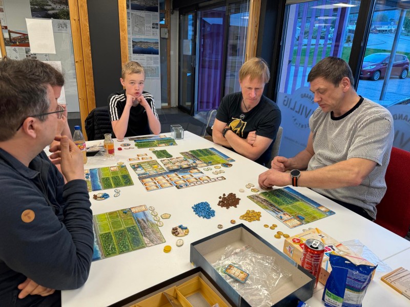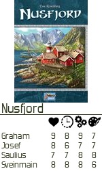 Med 9 spillere så var det enten 3 spillere på 3 bord eller 4 og 5. Valget falt på det siste, og Graham tok frem Nusfjord. Så nå skulle vi til et fiskevær i Lofoten, få tak i fisk, tømmer og gull og omsette disse i seierspoeng på oppdragskort.