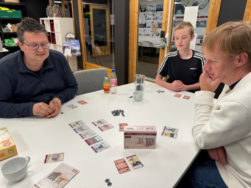 4 stk ble igjen, og vi spilte en runde Coup Guatemala 1954. Her skulle vi prøve å samle inn penger, nok til å kunne drepe de andre. Alle startet med 2 liv og du kunne som i kortspillet lygern påstå at den som hevdet at de hadde bank-kort(som gav godt med penger) løy. Gjorde de det mistet de ett liv, gjorde de det ikke mistet du et liv. Sveinmain døde kjapt i dette spillet. Så var det en kamp om de andre. Takras klarte også å drepe seg selv, så var det bare Kjell Henrik og Josef igjen. Josef samlet seg opp nok penger til å drepe Kjell Henrik og vant overlegent. Kjapt spill, men kjekt? Må nok spille flere runder får å få fullt utbytte av mekanismen i dette spillet.