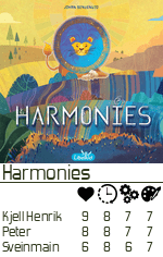 Harmonies var et lettlært og tettspilt spill. Men temmelig abstrakt og en måtte legge brikker i bestemte mønstre både i høyde og bredden som gav poeng. 9, 8 og taperen gav 6 på terningen.
