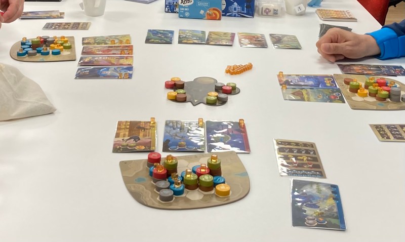 På det andre bordet ble det spilt Harmonies. Peter, Sveinmain og Kjell Henrik skulle samle ressurser og bygge ulike oppgaver på kort. En måtte derfor klare å satse poeng både på brettet og på kortene en trakk inn. Sveinmain ble vel litt cardwatching, mens Peter og Kjell Henrik klarte å ha 2 tanker i hodet samtidig. Peter fikk en fordel når han overlumplet alle med å avsluttet spillet. Planene til Sveinmain og Kjell Henrik gikk i vasken, men var det nok til å vinne? Kjell Henrik tok seieren et par poeng foran Peter som var et lite hav foran Sveinmain.