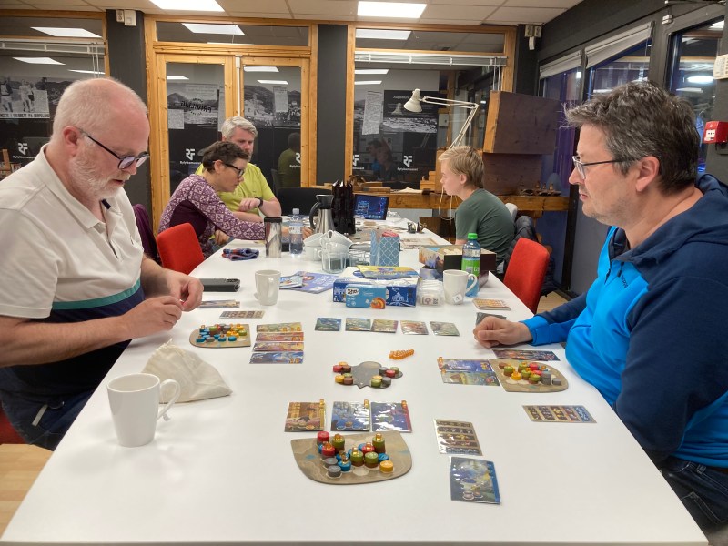 Da er endelig brettspillsesongen i gang. Selv med stabilt brettspillvær hele sommeren har en prøvd å late som om andre ting enn brettspill er viktigere. Men nå er endelig det herlige livet tilbake og Sveinmain hadde called in the troops. 6 stk møtte opp, og de ivrigste klarte ikke vente på at lokalene åpnet og tok en runde Heck Merk utenfor lokalet. Peter, Josef og Kjell Henrik kjempet om makker, og poeng. Kjell Henrik fikk lite av det, men Peter og Josef tok et oppgjør ala Markens grøde. Josef vant med 9 makker foran Peters 8! Et godt likt spill som egner seg godt både til forrett og dessert.