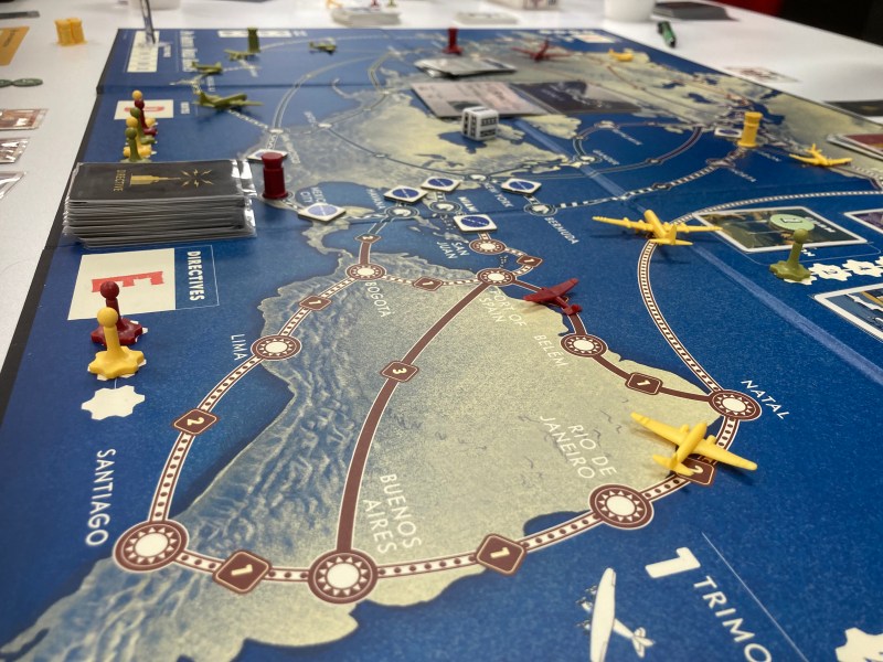 Kvelden var knapt begynt og Kjell Henrik hadde tatt med seg Pan Am – spillet om det amerikanske flyselskapet som gikk konkurs i 1991. Frem til da var de et selskap som ekspanderte fra Florida og utover hele verden. Kartet på spillet var et verdenskart sett ovenfra på en merkelig måte, men etter litt trening så vi hvor Norge var og resten av verden. Så da var det bare å kjøpe fly, skaffe destinasjoner, kjøpe flyplasser og sette inn fly på strekningene. I dette worker placementspillet ble det litt knuffing om plassene og de fleste kunne en by over motspilleren, men hvor høyt skulle en gå?