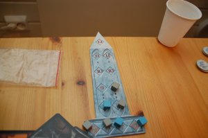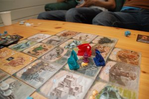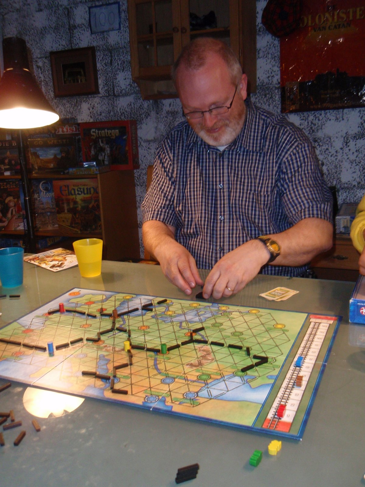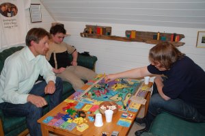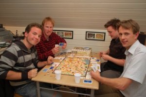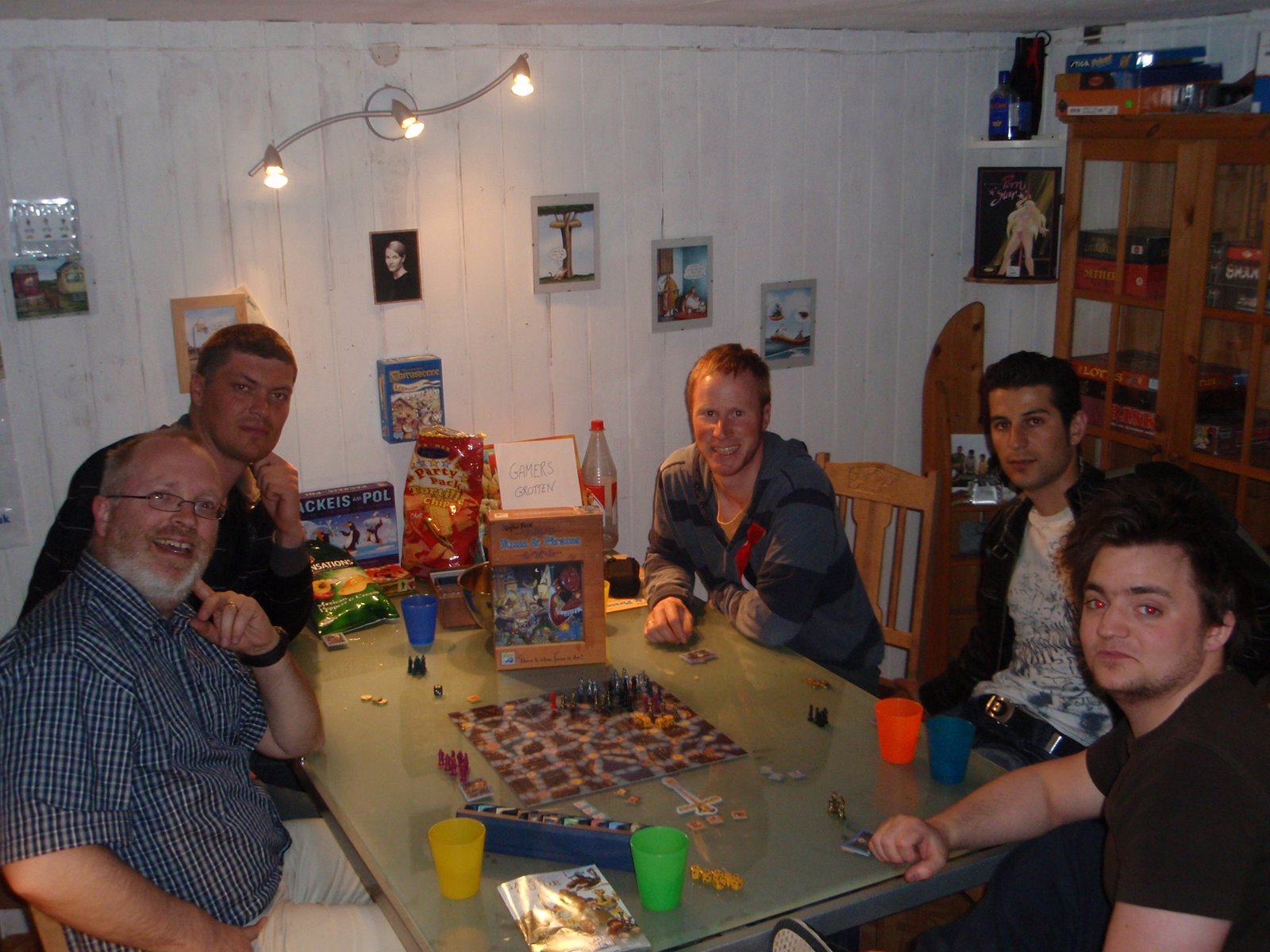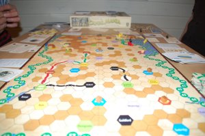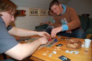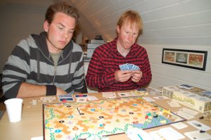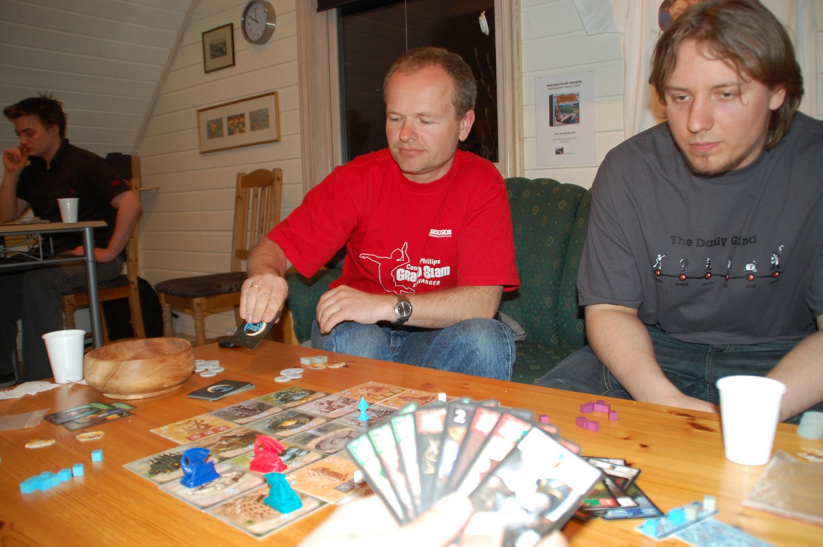 jennomgang av reglene, så var alle klare. Det ble noen harde runder hvor det gjaldt å sikre seg råstoffer som igjen gir seierspoeng. Men en må også passe på pengene sine, for hvis ikke vil en slite. Første skulle en plassere menn for å få ressurser, og dette ble mye kniving om begrensede ressurser. Utvidelsen hadde heldigvis tatt hensyn til dette og ordnet slik at en kunne plassere ut menn og få seierspoeng direkte. Dette var noe Hollender tidlig benyttet seg av. Når han i tillegg satset på seierspoeng tidlig også for sine byggmestere tok han en tidlig ledelse. Peter tok også ledelsen i spillet, men det var på Penger. Han benyttet den nye havnene til å selge varer, for så å kjøpe de billigere på markedet i samme omgang. Hvorvidt dette lønte seg kan dere se på resultatet. Det var mye å ta hensyn til underveis, så hver spiller fikk i gjennomsnitt 5 minu