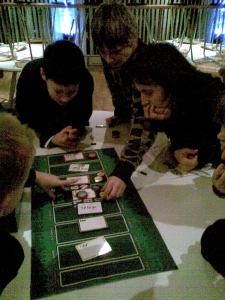 Med så mange tilstede skjedde noe unikt i allefall i PG målestokk. Vi måtte rett og slett ta en presentasjonsrunde. I tillegg avholdt kasserer Black ant årsmøtet i PG etter gjeldende regler i Hyperion. Styret ble valgt videre ved aklamasjon. Fornøyde delte vi oss opp på to bord. 5 på hver. Tempus ble valgt på det ene, og Puerto Rico på det andre. Litt ut i spillet dukket plutselig Innante opp, og KLUBBREKORDEN var et faktum. Men da var det fullt på alle bord, så Innante måtte velge mellom enten å se på, eller å spille Twister med seg selv på gulvet, da det ikke var mere bordplass i herberget. Overraskende nok valgte han det første.