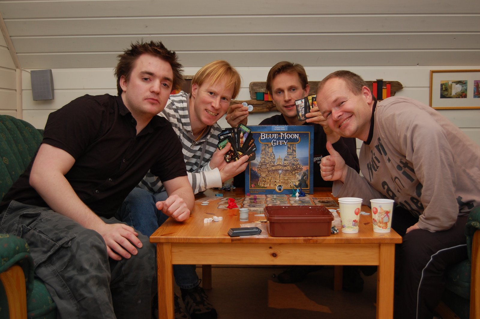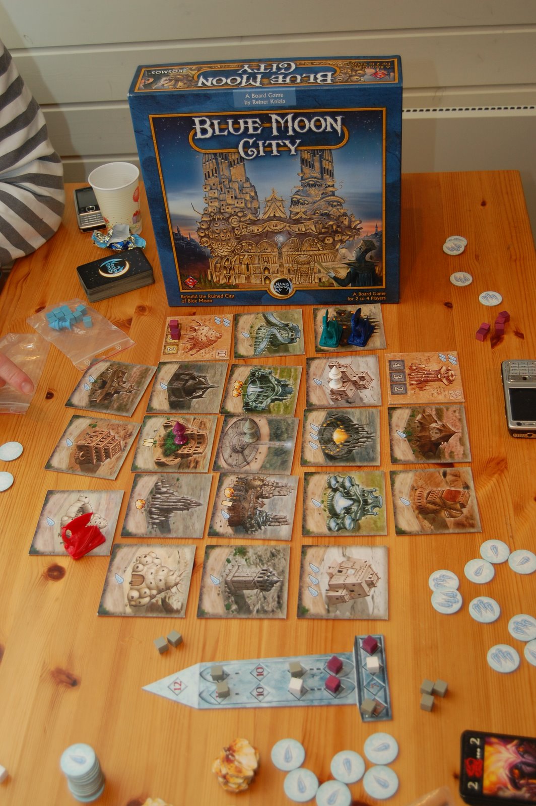 Etter bybesøket sist mandag, hadde Preikestolen Gamers denne mandagen tilpasset spilletiden sin, for at den bedre skulle passe med ivrige Stavangerfolk som evt. skulle komme i hopetall med Tauferga. Oppstart var satt til kl. 20.00. Ingen kom med Tauferga, men etter hvert dukket det opp akkurat nok spillere til å fylle bordet på spillet Sveinmain hadde forberedt til kvelden: Blue Moon City. Spillet var Secret Garbage-gave fra Melin i Stavanger. Så spillet ble høytidelig åpnet med å spise de 4 konfektbitene han hadde lagt med eska(de falt i smak), og spillet var i gang. Vi skulle gjennoppbygge Blue Moon City etter at byen h