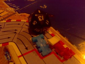 Kort, et lite brett, noen brikker, men likevel temmelige avanserte regler til å være et så lite auksjonsspill. Her gjaldt det å by på varer, inkludert sine egne, selge de enten ved å få penger, eller seierspoeng. Bunkre opp noen kort til neste runde og på an igjen. Torleiv tok en tidlig ledelse da han fikk full pott på seierspoeng i de 2 første rundene, Sveinmain fulgte hakk i hel selv om han av og til som dere ser av det ene bildet fikk ANALYSE PARALYSE. Hollender og Peter fulgte ikke langt bak i motsetning til Black ant som lå meget langt bak. Etter 5 meget tette runder hvor Torleiv på slutten hadde fått litt likviditetsproblemer klarte Sveinmain etter slutt-tellingen å få høyere brikkestabel enn Torleiv og var sikker på at han hadde vunnet. Men, Peter som hadde lagt brikkene sine flatt istedet for å stable dem kom pluteselig med en såpass høy stabel at han vant til Sveinmains store ergrelse, og de andres jubel selvfølgelig. Surt, men Sveinmain gikk på v