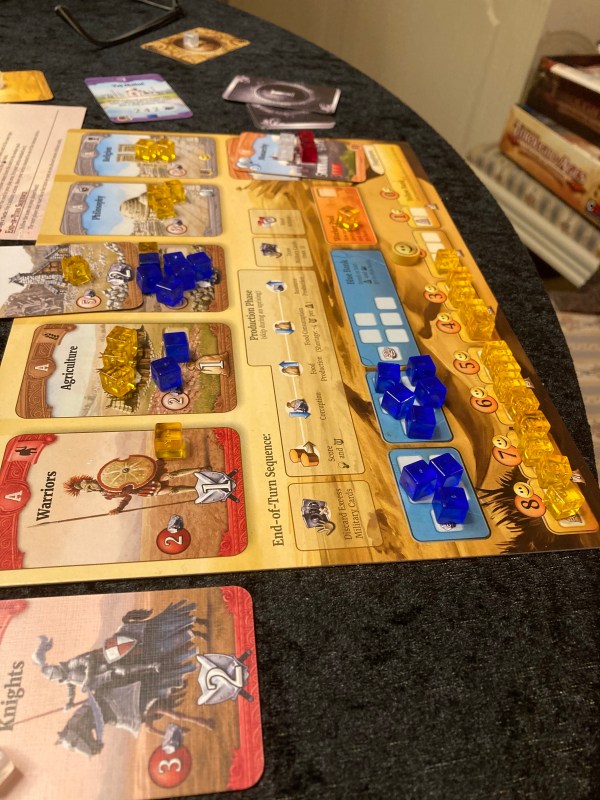 Sveinmain og Afro hadde tatt turen og med 3 spillere er tilnærmet perfekt antall for dette spillet. Peter tok oss igjennom reglene og så var vi i gang med preage. I preage skal vi alle utvikle oss litt før vi går inn i spillets første sivilisasjonsfase av 3 mulige. Husker ikke navnet på alle fasene, men kortene var politisk korrekte og sto for utviklingen i den fasen vi var i. Alle hadde et begrenset antall handlinger som kunne brukes på å kjøpe kort, utvikle militærmakt, bygge under eller utvikle teknologien. Sveinmain var redd Peter skulle bli en millitærbastion og tok de millitærkortene som kom og hadde i mesteparten av fase en millitærmakten i spillet. Den ble brukt mest mot Peter som hadde bygd seg opp en god motor.