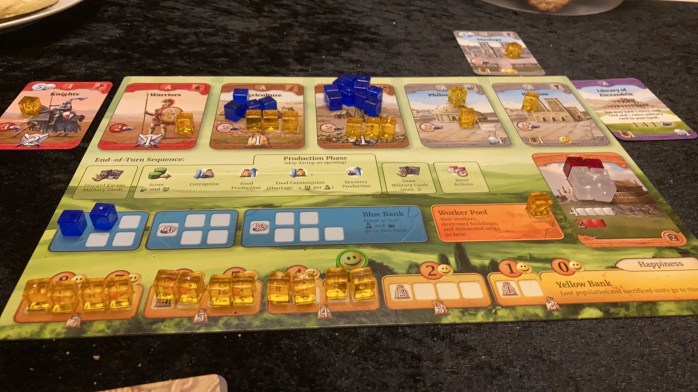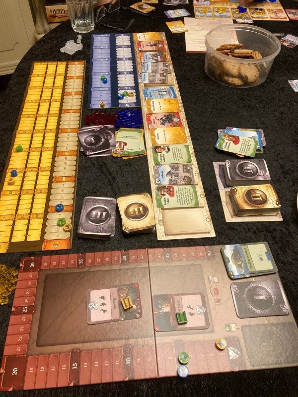 Det ble fort tydelig hvem som hadde kontroll her. Sveinmain fikk 2 poeng mens resten hadde 0. Han var også eneste med den 3. arbeideren, og det i runde 2! Penger er fint å ha. Worker placement? Skaff deg flere arbeidere.