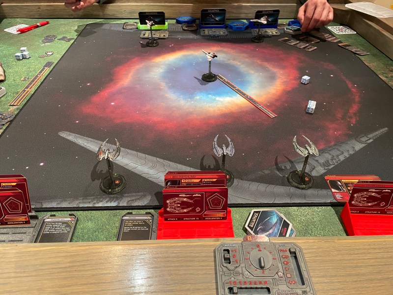 Vi spilte grunnreglene og hadde tre skip hver. En navngitt pilot satt i hvert skip og hadde med seg et talent-kort i tillegg. Vi spilte selvsagt også med kinetisk energi-reglene.