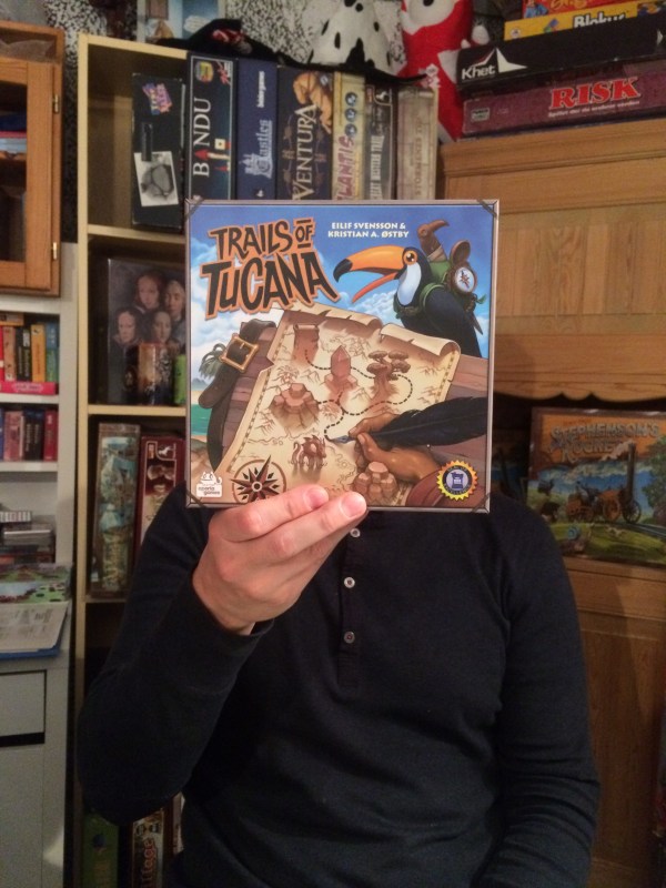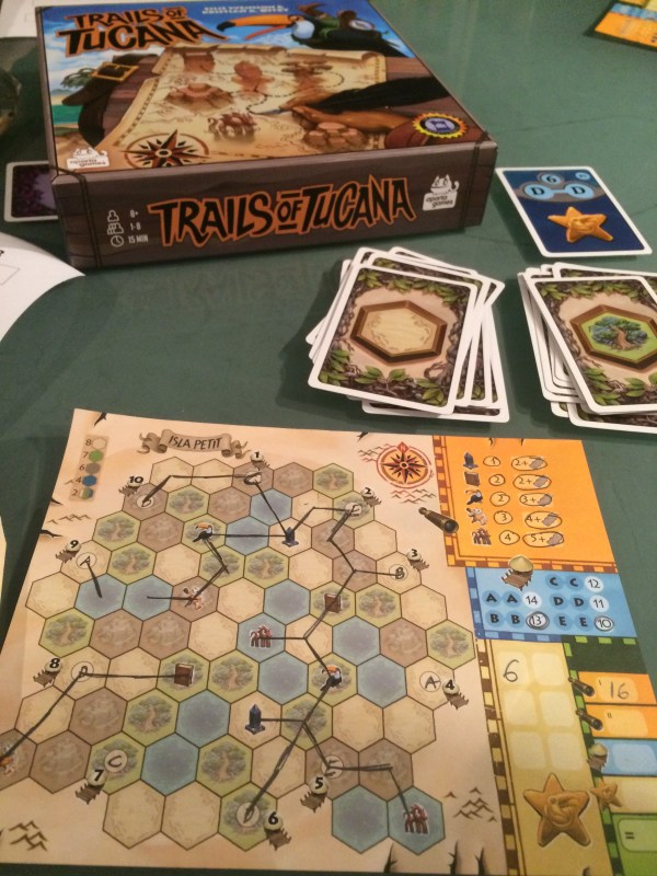 6 spillere skulle ta turen til Grotten denne mandagen, og Nappeto tok turen under fjorden fra Stavanger. Mens vi ventet på flere spillere tok vi en tur til roll & writespillet Trail of Tucana. Etter en kjapp regelforklaring var vi i gang. Litt for kjapp forklaring denne gangen da ingen husket å ta bonuspoengkortene som lå godt synlig for alle spillerne.