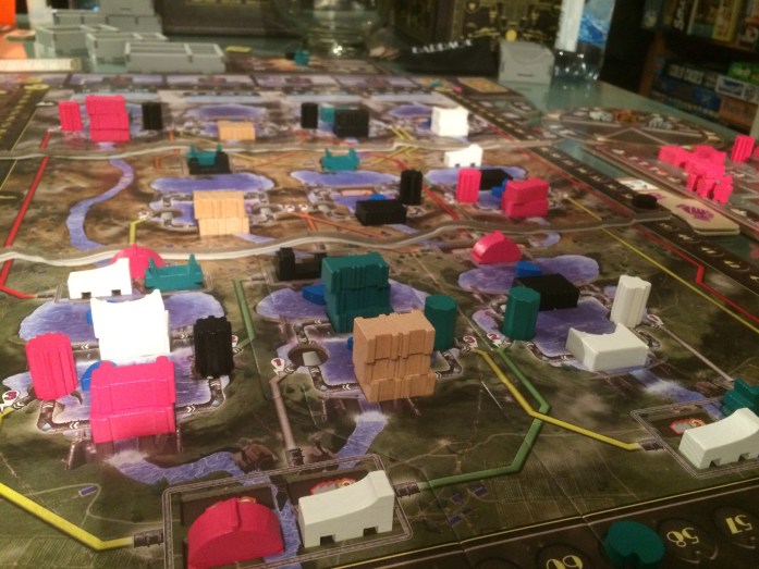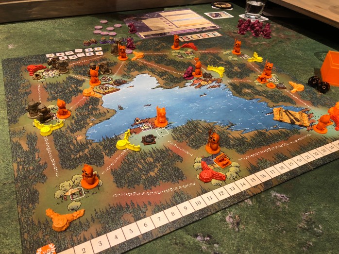 Her skal vi utvikle tomtene på brettet vårt som alle grenser til elva. Vi skal hente landskapsbrikker, 3 sorter råstoff eller bruke disse til å score poeng på oppdragskort. Ikke veldig avansert, men likevel nok til at vi får nok valg til at det blir vanskelig nok + at en kan ødelegge for hverandre. Etter ca 45 minutter så er spillet ferdig. Ingen vet hvem som ville vinne, og derfor er tellingen ekstra spennende. Peter scoret 40 poeng, Sveinmain 43, mens Afro kunne hoppe i elva av glede med hele 44 poeng.