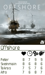 Men bortsett fra det hadde spillene ingen likheter. I Offshore bør spillerne samarbeide litt. Hvor mye er opp til hver enkelt. Men hvert oljefelt kan åpnes av 2 spillere og begge får alle fordeler av å gjøre dette, så hvorfor ikke. Før og etterpå er begge sin egen lykkes smed selvsagt. Når et felt åpnes skal det borres. Det er selvsagt med en viss risiko(blow-out) som i det virkelige liv, så også i Offshore. Det er lagt inn en puch your luck mekanisme som fikk stemningen i grotten i taket. De som ikke var med på moroa prøvde det de kunne for å presse de som borret etter olje til å borre litt dypere, for å øke sjansen for at alt kollapser og gevinsten ble derretter. Det hele ble en jevn affære, men Robert tok Afro med et simplet poeng, mens Peter sikret 3. plassen 5 poeng bak med ett poeng på Sveinmain.