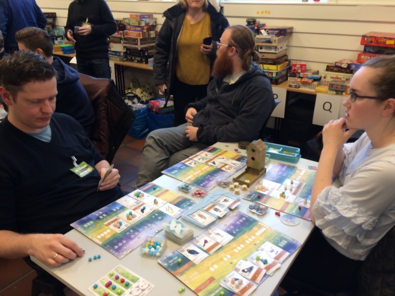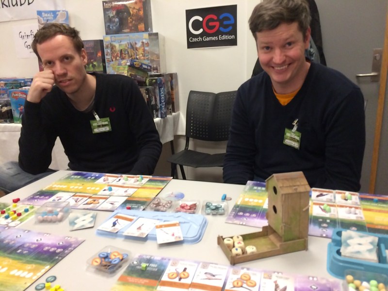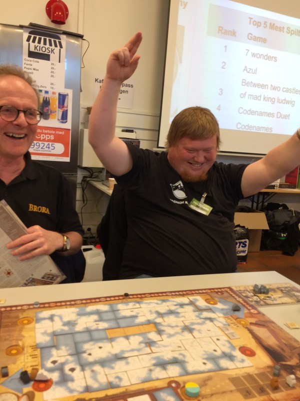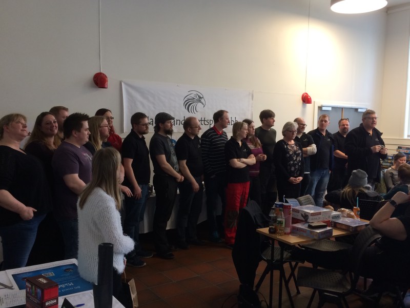 Søndag – en chill dag, så også denne gangen. Småtrøtt og sliten etter mye spilling, men det var ennå en time til Einar Hansen-show. Andreas var klar for litt spilling og Vingspan ble redningen. Anne Margrete hev seg med og rett før kom også Andårs. Like vakkert denne gangen og jeg fikk mer flyten i spillet. Likevel synes jeg fortsatt at det er helt OK, selv om jeg har lyst til å like det bedre. 7/10 denne gangen. Gi denne mannen en medalje! Hvem tilbringer bryllupsdagen sin med å rydde og ordne for at vi skal kunne nyte brettspillets gleder. Jo, Einar og Hanne. Istedet ledet han oss gjennom en prikkfri avslutning hvor alle kunne gå fornøyde hjem med hvert sitt spill under armen. Men han er ikke alene! Denne gjengen med frivillige har stått på tidlig og sent for at vi skulle kose oss. Og de blir bare flere fra år til år. Må kjøpe vidvinkellinse til neste år hvis de blir enda flere. De har vært imponerende positive og alltid vært på tilbudssiden hvis en lurte på noe eller trengte hjelp til regler eller praktiske ting. Godt gjennomført prikkfritt arrangement, både planlegging, gjennomføringsmessig og ikke minst trivselsmessig. Gleder meg allerede til neste år, og da kommer jeg selvsagt på torsdag igjen. Til dere alle – tusen takk, det er bare å ta av seg hatten, gi 100 av 100 på skalaen, da det ikke er noe å trekke. Sees neste år. En stoooor tommel opp fra meg!