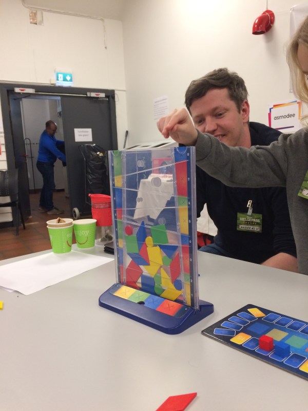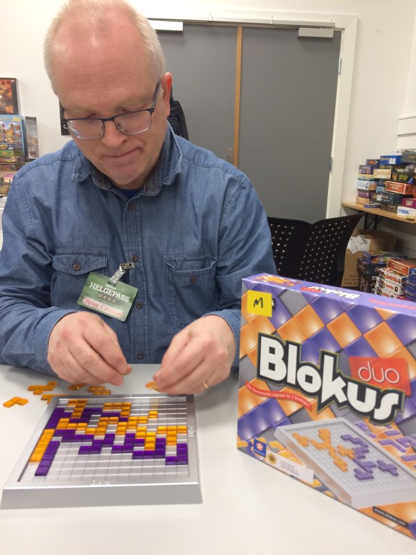 Alle forsvant i hver sin retning og denne gjengen skulle spille racingspillet Steampunk Rally og hadde plas . Selv om Jonas nesten hadde forklart ferdig reglene, så tok han selvsagt en regelrunde til – imponerende. Aldri vært med på et så komplekst racingspill før, og heller aldri vært med på et racingspill hvor alle flytter samtidig, uten å se hva den andre gjør. Ole, Jonas og Sigbjørn hadde en fantastisk innlevelse i spill og tema, og det må du ha når du spiller Steampunk Rally. 7/10. Så var det auksjon(glemte å ta bilde). Bruker aukjsonen som en anledning til å bytte spill jeg ikke vil ha lengre, med nye. Denne gangen kom Colony og Sola Fide inn i samlingen, så da blir våren litt kortere. Salen tømte seg etter Auksjonen og mens vi ventet på at noe skulle skje tok jeg og Peter en runde Blokus Duo. Sperret han raskt inne med mine lilla brikker, og når Andreas og Tom dukket opp pakket vi sammen.