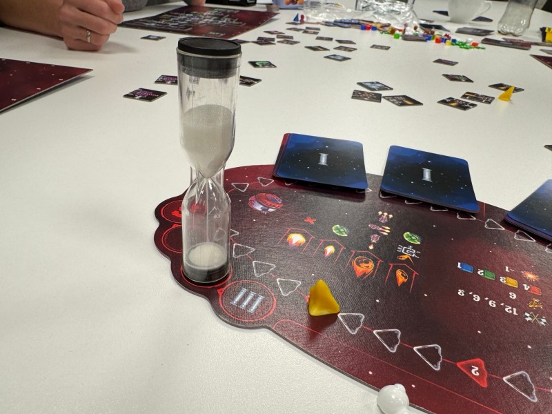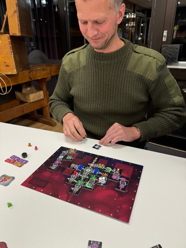 Så til kveldens hovedrett – Space Rase, må ikke forveksles med den hurtigere spillet SpaceBace. Takras hadde tatt med egen matte, og romskipene var nesten ekte vare. Her skulle stormaktene Kina, Sovjet, EU og det private foretaket Musk Company ta opp jakten på hegemoniet i verdensrommet. Det var ulike måter å score poeng på og lå du sist fikk du en fordel om du havnet der den foran deg sto. Da gikk du foran. Og den som lå sist flyttet alltid først, på den måten var det mulig å jevne spillet litt ut. Sveinmain fikk en kjempefordel til å begynne med med å tapetsere hele første romprosjekt med sine brikker. Så tok de andre opp jakten.