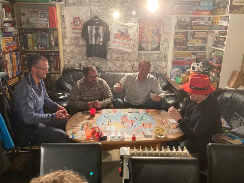 Så var vi fulltallig. Robert, Vegard og Melanie ble med Sveinmain til Der untergang von Pompeji – en 20 år gammel klassiker. Her skulle alle flytte inn i Pompeii etter at noen småskjelv hadde tømt byen for folk. Etterhvert strømmet det på med familiemedlemmer, til det store vulkanutbruddet kom over byen og alle skulle prøve å få sine folk ut av byen uten å drukne i lava. Tematisk meget bra spill, hvor du svetter når lavaen strømmer inn i byen og du må velge hvem du skal redde og hvem du skal ofre. Og ikke minst gleden når du kan sende dine motstandere i vulkanen.
