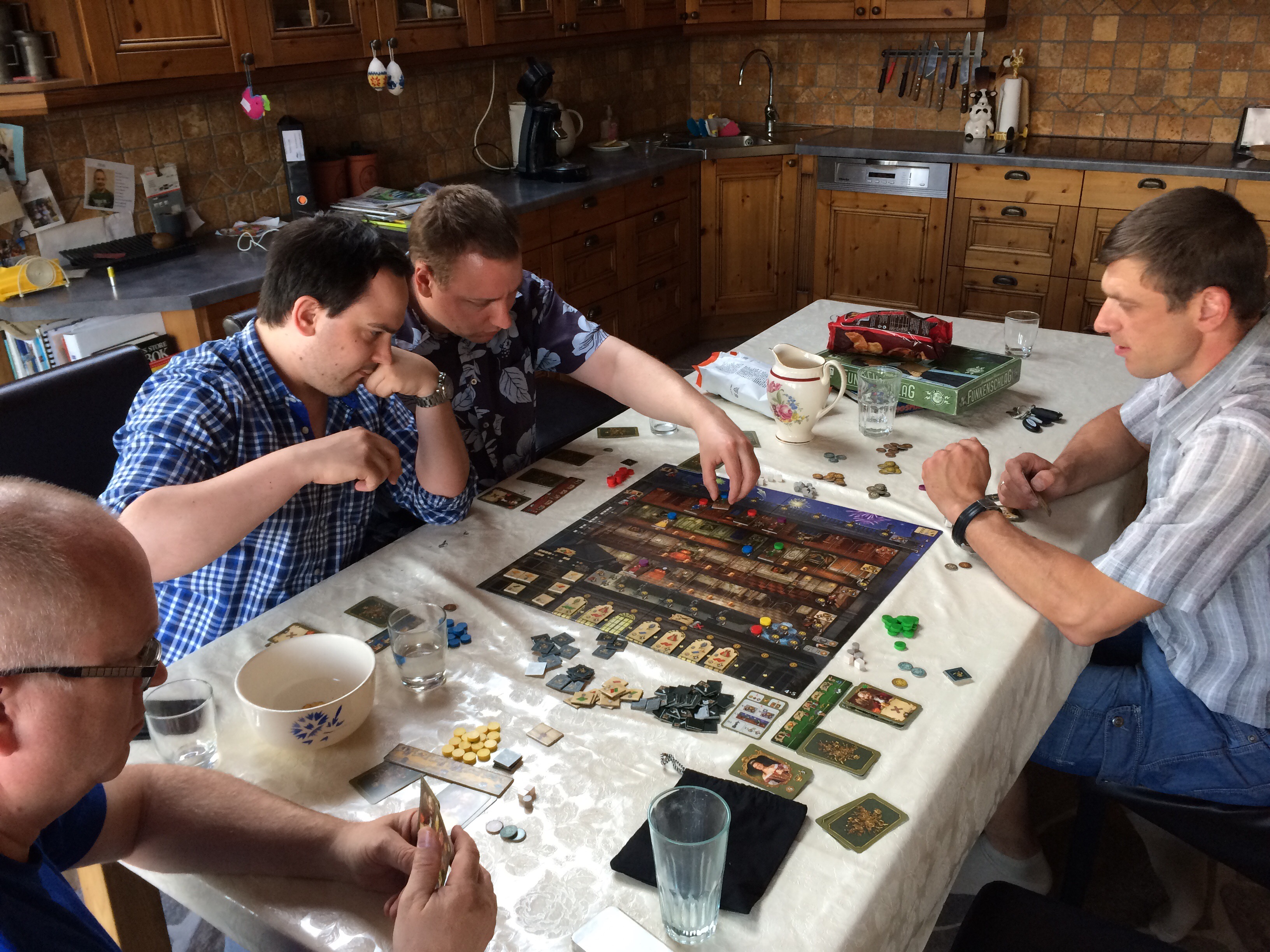 Som en avslutter tok vi en runde Splendor. Petter som trodde han kunne spillet fikk seg en liten aha-opplevelse. Men vi andre ringrever gav hverandre god motstand. Det var faktisk lite sabotasje denne gangen, og alle konsentrerte seg om sitt. Peter hadde vel nesten alle de gule jokerbrikkene, og i perioder var banken skåltom og ingen ville levere noe i fra seg. Pift lurte på om spillet var dødt, men det løsnet såpass at Sveinmain klarte å avslutte en runde før Peter. Men som tidligere er det ikke alltid den som nesten avslutter som får 2. plassen… 1. Sveinmain 16, 2. Pift 12, 3. Peter 11, 4. Petter 7.