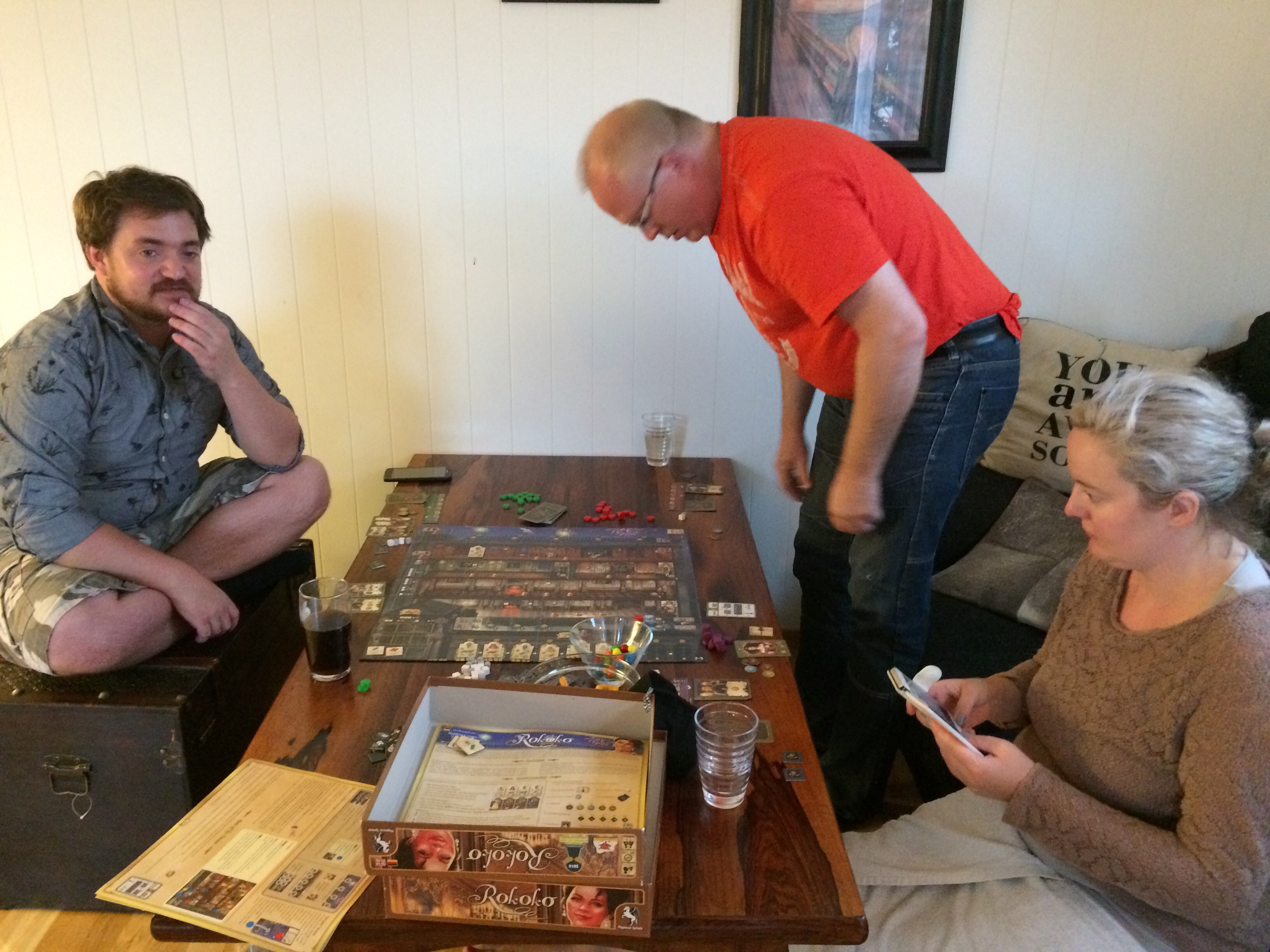 Rokoko var et spill som Saulius hadde vunnet i Haugesund, men ikke ennå spilt det etterpå. For Peter og Tom Erik var det første gang, mens Vegard husket to tap mot Hollender godt. Han valgte å sette seg på andre siden av bordet denne gangen. Lette regler og vanskelige valg er nøkkelord i dette flotte spillet hvor man spiller ut kort til å kunne utføre visse handlinger. Det finnes tre arbeidskort som i hierarkisk rekkefølge kan utføre flere handlinger. En mester kan så utføre alle, mens en lærling bare noen få. I løpet av spillet kan man få nye kort, slik at «bunken» med kort blir tykkere. Alt dreier seg om å utstille drakter og kjoler i de ulike etasjer i palasset. Hver etasje gir poeng til majoritet og nummer to. I tillegg kan man få poeng for utsmykninger. Vegard startet bra med dyre drakter i den øverste etasje som gir tilgang til fyrverkeriet på takterassen. Peter gav ham hard kamp, men Vegard sikret seg her viktige poeng. Hollender søkte sin lykke på andre etasjer. Tom Erik og Saulius konsentrerte seg også om andre plasser. Det ble mye sukking og stønning da noen hadde tatt plasser som andre også siktet på. Saulius var PGs dommer med å passe på at ingen kunne jukse. Peter og Tom Erik skilte seg ut med mye tenking (helst når de hadde turen selv). Peter mente at ikke regelen var forklart godt nok da han så at