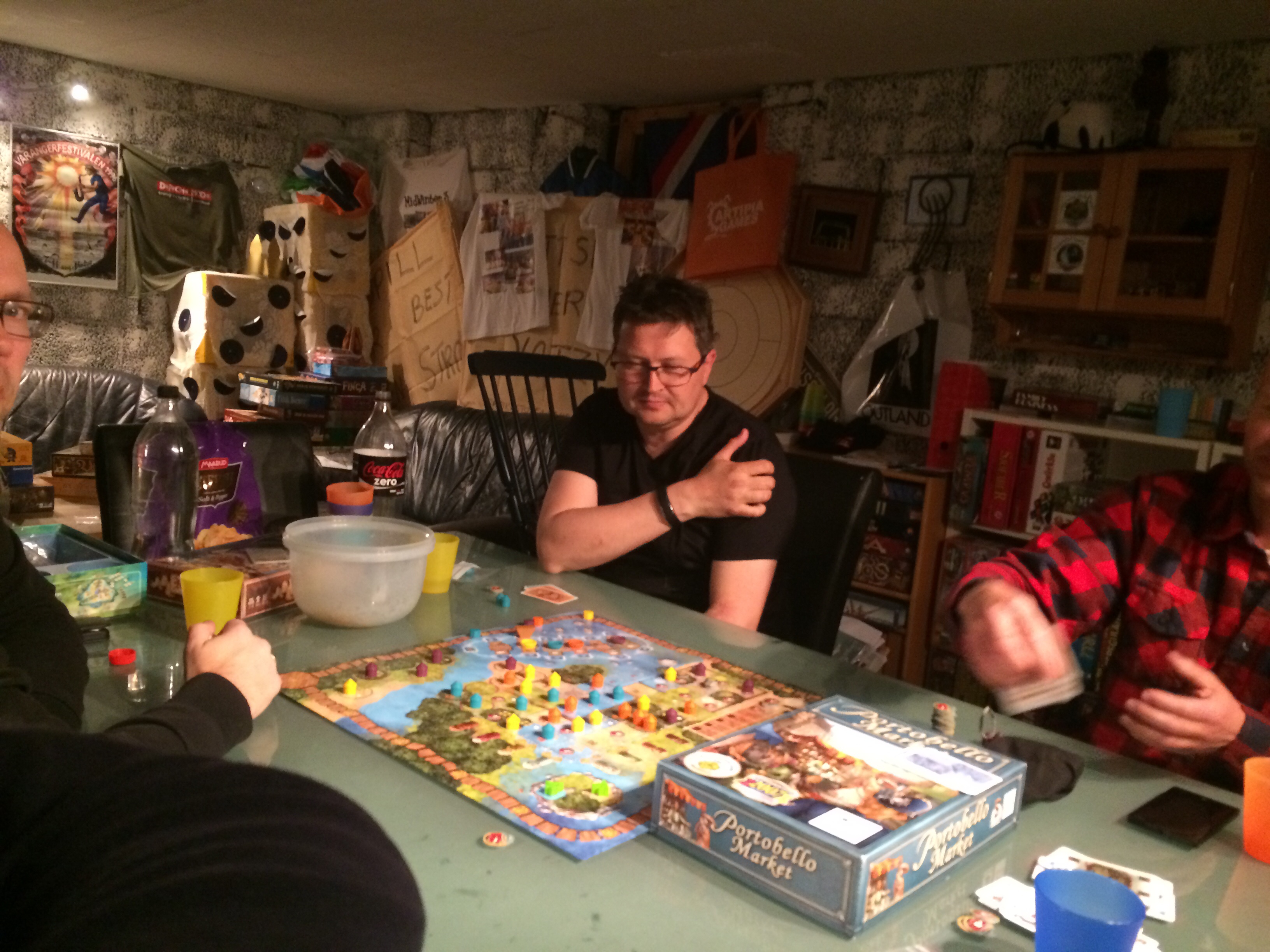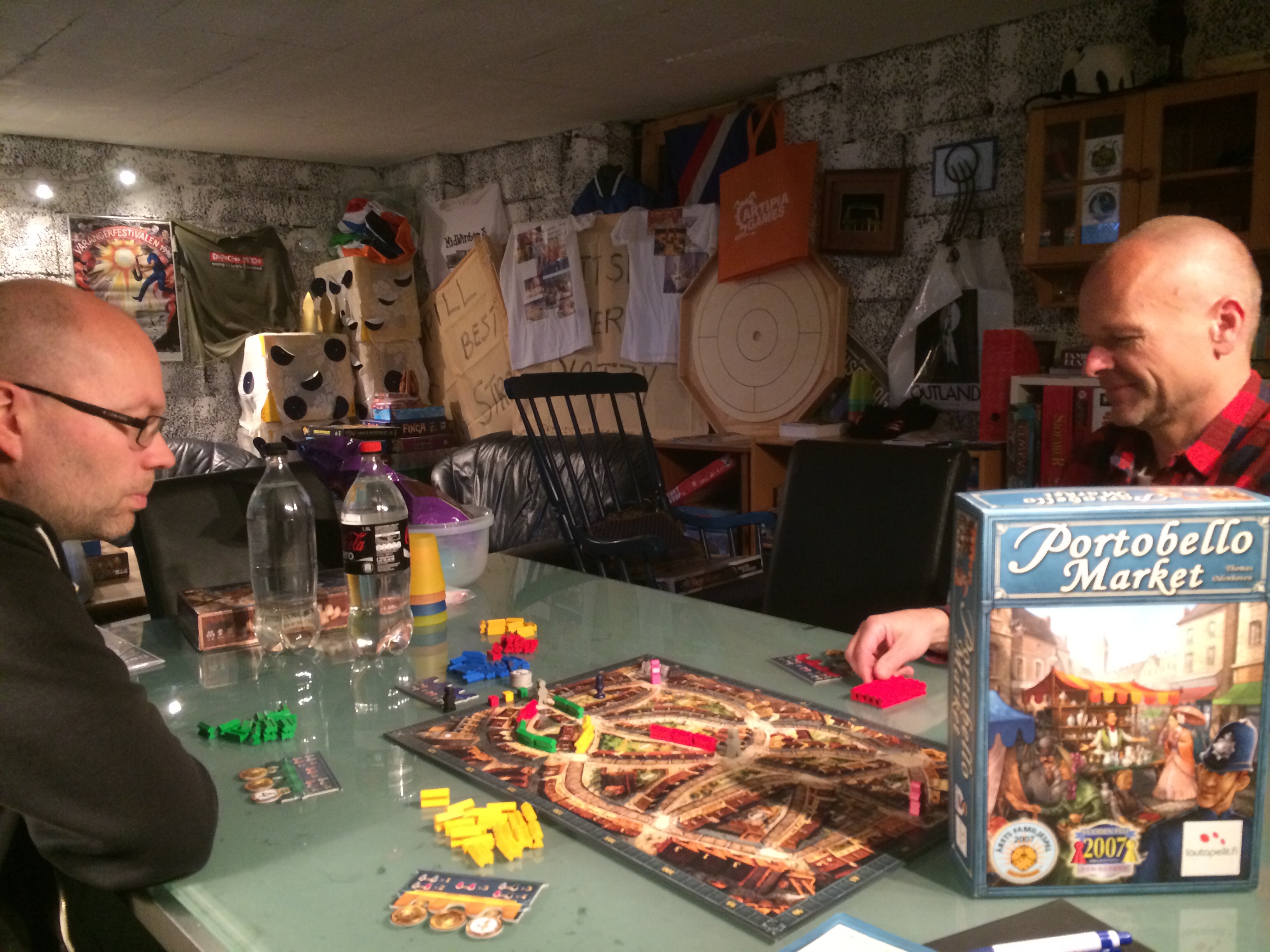 Kjell Henrik måtte ut er ærend, og vi andre tok oss en tur til Portobello Market i mellomtiden. Etter å ha startet 3 ganger fikk vi endelig dreisen på reglene. Markedene poppet opp og bobbyen som må stå der en bygger flyttet seg taktisk flere ganger. Handelsmenn i ulike farger som gav ulike poeng kom ut av posen og det ble litt finregning på slutten. Robert høstet gode poeng med å høste poeng fra kvartalene som hver spiller kun kan gjøre 2 ganger i spillet og kun Robert gjennomførte, men likevel var det temmelig jevnt på slutten før Robert avsluttet med en skikkelig poengsamlerunde. 1. Robert 117, 2. Sveinmain 105, 3. Black ant 90.
