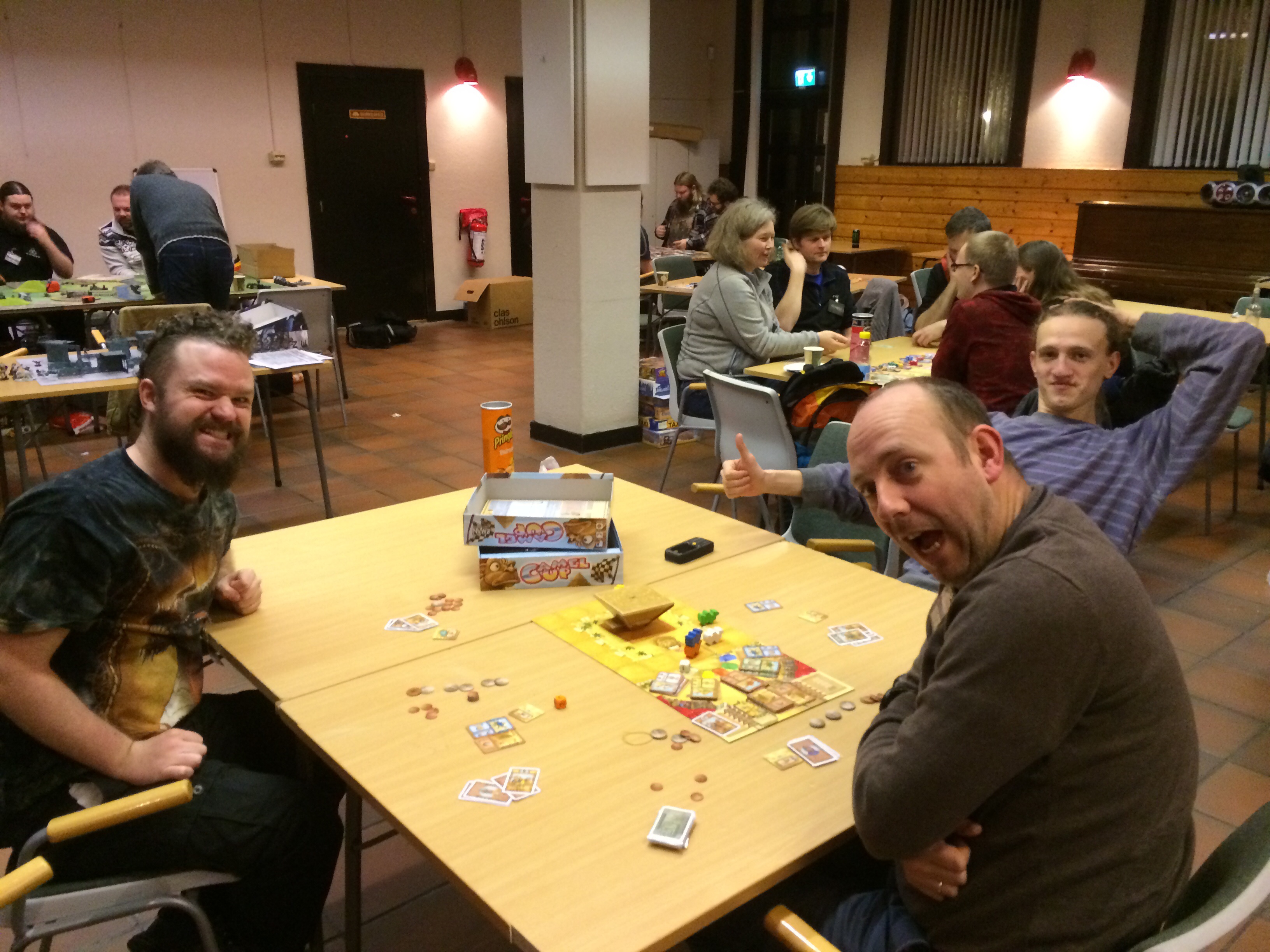 Lørdag – opp i rett tid til frokost hos Svigers før meg og Black ant før en ankom the Slaughterhouse kl. 11.30. Det traff vi Saulius som kun hadde en halv time til rådighet før han skulle til Tysvær å spille basket. Hva rekker en på en halv time? Jo, MWs store hit: Splendor. Sveinmain hadde spilt før og forklarte reglene. Anne Marije holdt oss med selskap, men skulle ikke spille. Men vips, så var hun med likevel. I PG er vi vant med at Hollender er med å spiller, og han er alltid ferdig før vi andre er halvveis. Men uten han ble spillet et jevnt og spennende spill. 5 poeng skilte vinner og taper og innen for tidsfristen selvsagt. Liker det bedre og bedre 7/10!