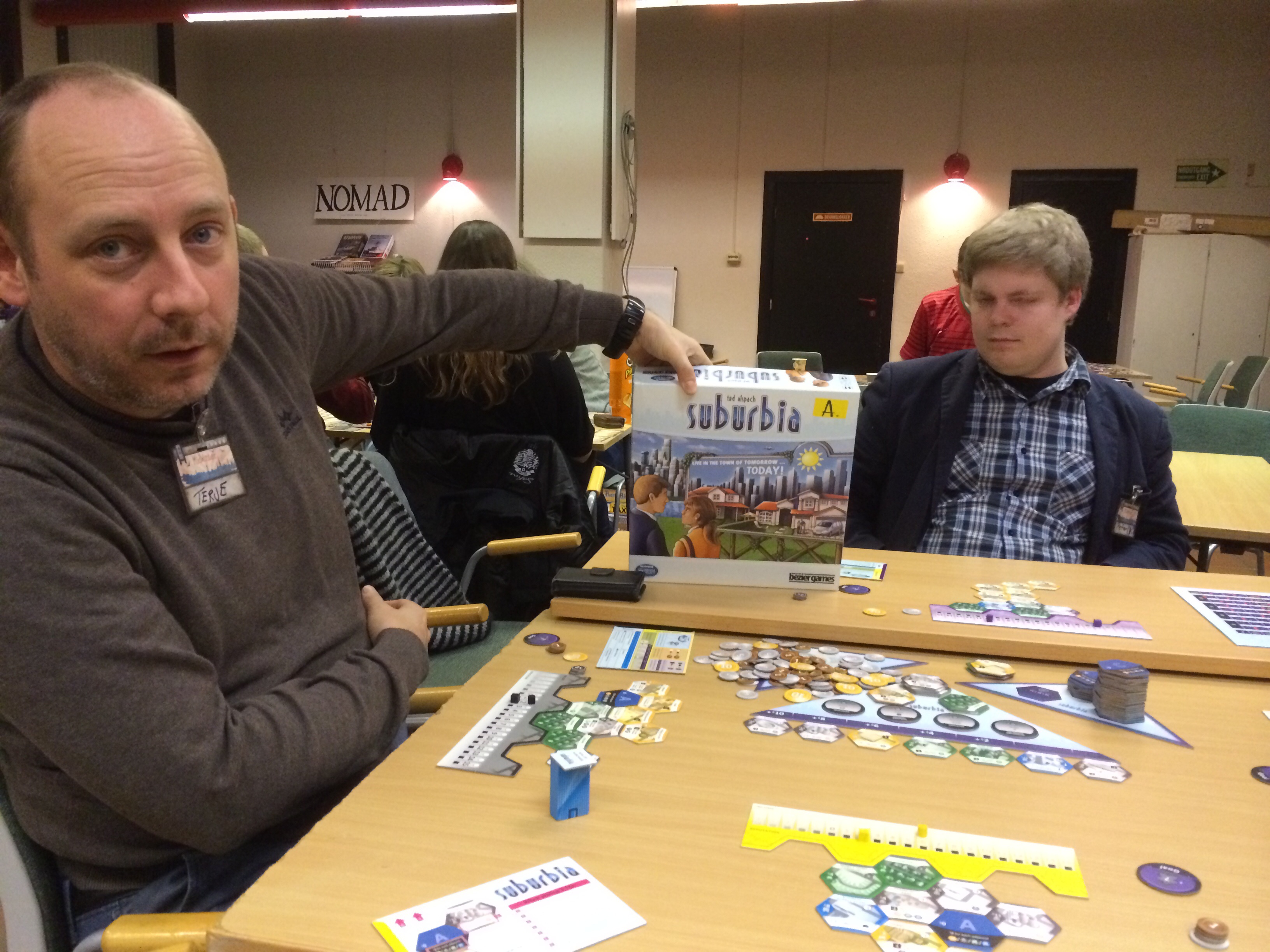 Lars Morten var gira på Suberbia, og jeg hentet Terje inn for å bli med i et spill jeg hadde veldig lyst til å teste ut. Sammen med Lars Mortens kompis Peter skulle vi bygge opp våre bydeler og score fame og få penger. God regelforklaring av Lars Morten avdekket et spill ikke ulikt Castle of mad king Ludvig som visst nok bygger på dette spillet. Suberbia var kjedeligere på farger, men kanskje bedre på gameplay. Eneste jeg ikke likte var slutt-kriteriene. Jeg og Terje scoret likt på noen og da skulle ingen få poeng! Tulleregel. I Jeg ledet med 5 poeng, men scoret 15 på mitt flest blå bydeler kort, mens kortet til Lars Morten gav 20 poeng som sluttkriterie som nesten sa det samme uten noen logisk forklaring på at et sluttkriterie gir 15 og andre gir 20! Dermed tap til meg og tap til spillet. 5/10.