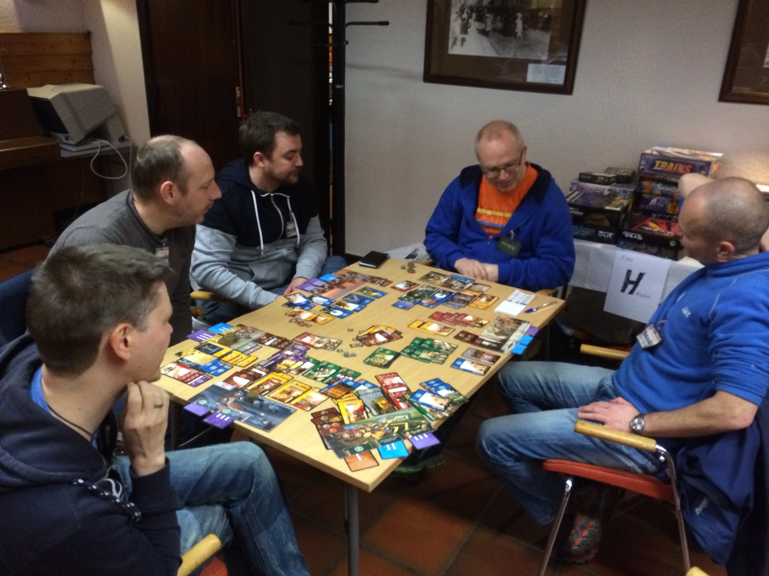 Hollender hadde tatt med Concordia og Robert har sin egen bucket-list hvor han skal spille alle BGG top100 i løpet av året. Reglene ble servert og handouts med norsk oversettelse fungerte godt nok en gang. Hollender startet og spilte en arkitekt. Alle fulgte denne oppskriften men valgte heller en diplomat som kopierte Hollenders handling. De første rundene var det mest fokus på bygging før Hollender viste hvordan man kan få flere og nye kort på hånd. Så begynte sankingen av flest mulig like kort. Sveinmain slet med å holde oversikt, men han satt mer enn godt i veien for Hollender både på brettet og ved kjøp av nye kort. Peter fikk ut mange kolonister og spredde seg godt på brettet. Robert som etter egne uttalelser alltid sliter i nye spill, klarte å henge godt med. Noe tenketid blir det her og der når tenkemestere har samlet seg, men likevel var det alltid kort tid før det var din tur igjen. Mot slutten av spillet var