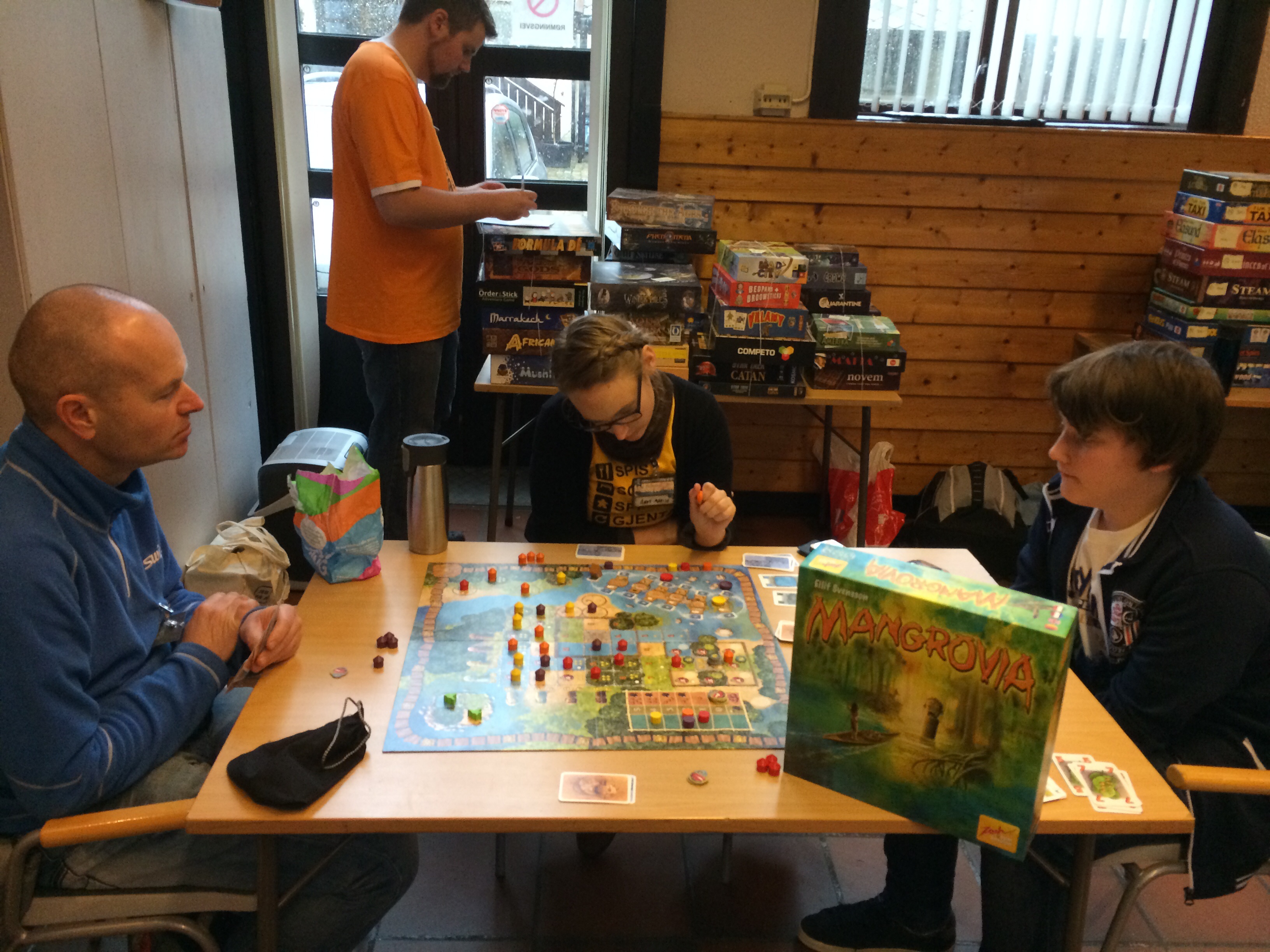 Saulius stakk og Sveinmain fant frem Mangrovia et spill av norske Eilif Svensson. Daniel, en hyggelig gutt fra Karmøy joinet oss og Anne Marije forlot ikke skuta, og ble med meg og Black ant. Mangrovia ble meget godt mottatt blant både ungdommer og den kvinnelige delen av spillerne. Selv synes jeg det er et veldig behagelig passe langt spill, så også denne gangen. 9/10.