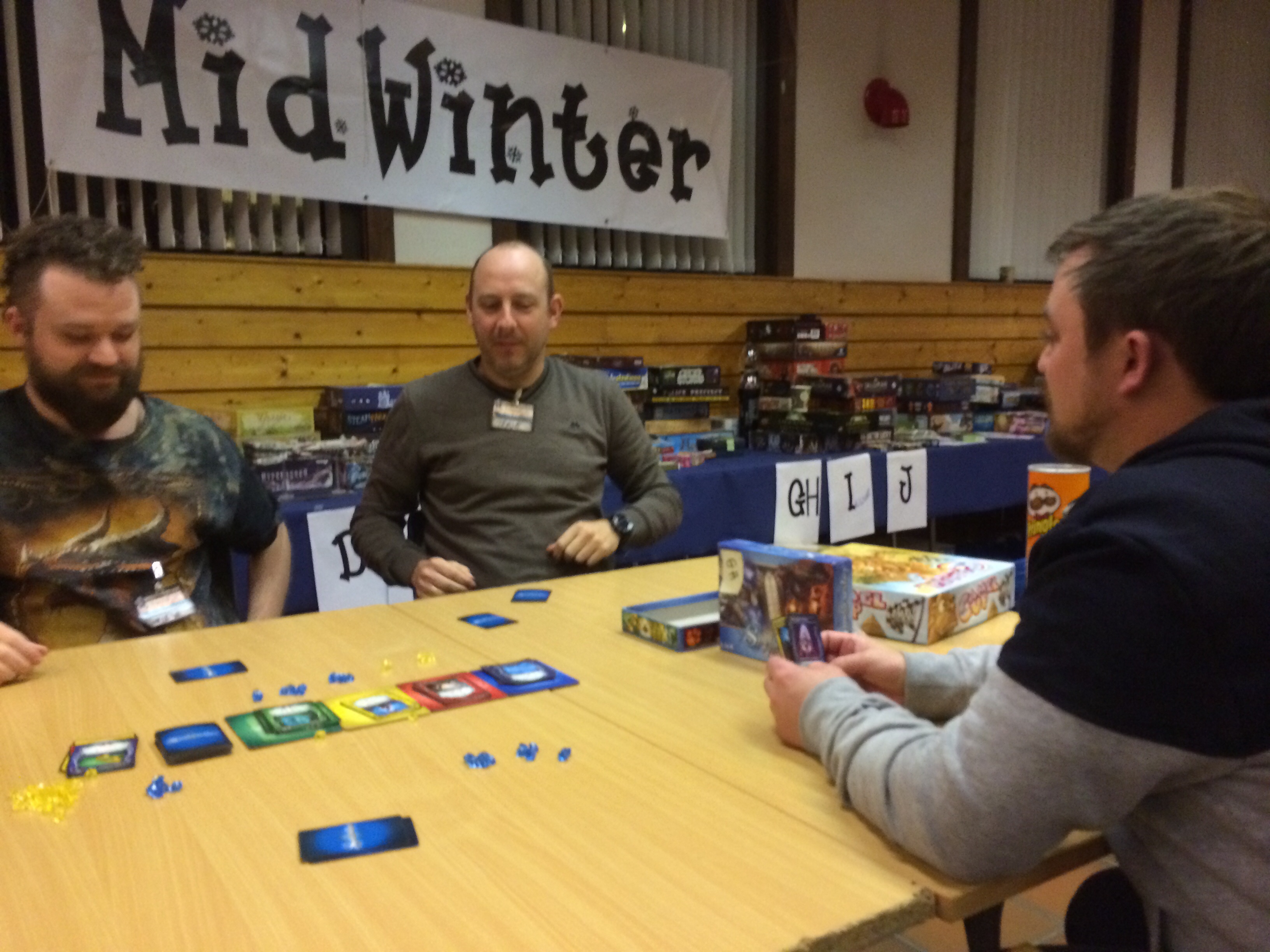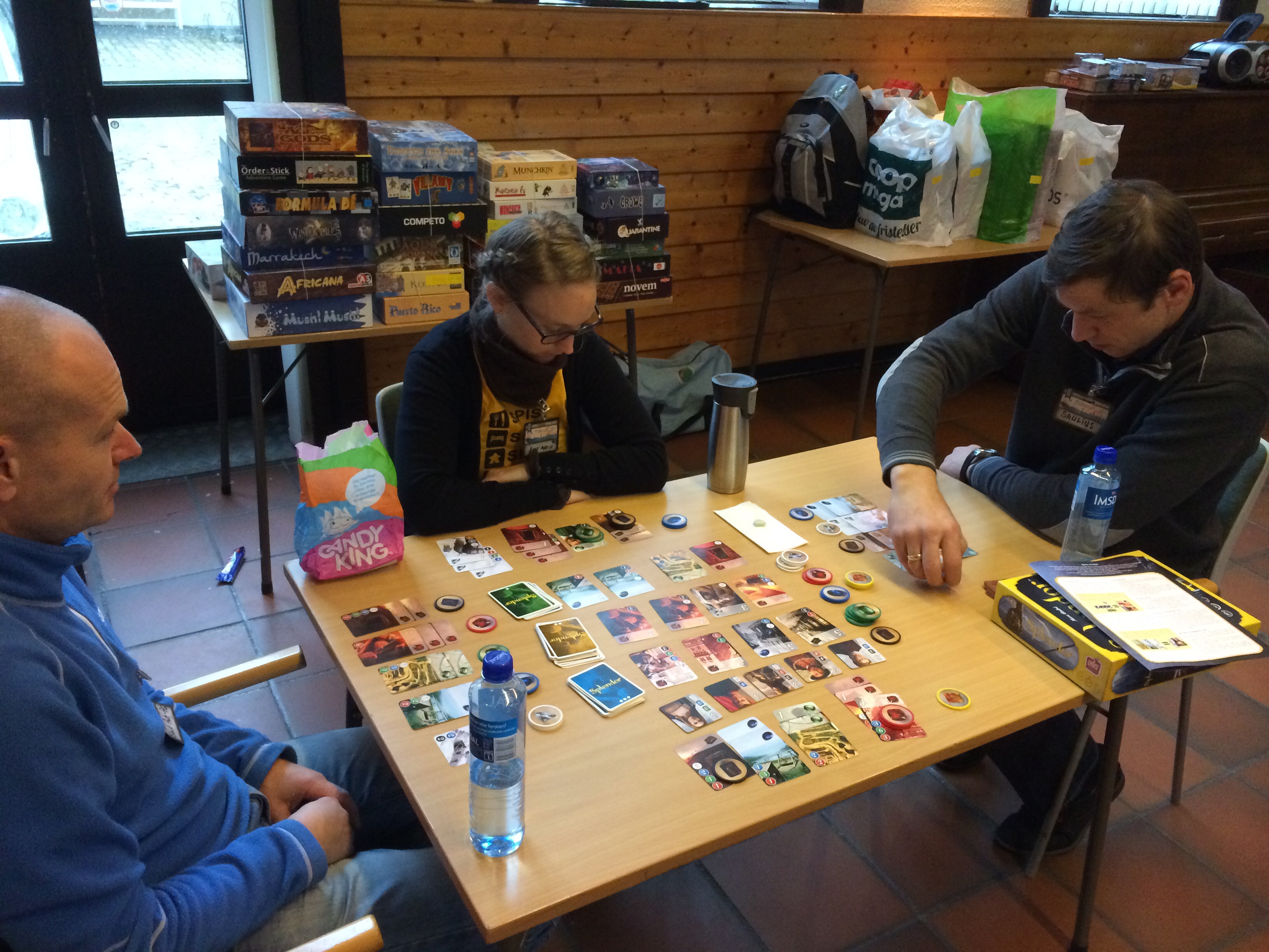 8 PGere hadde tatt turen til Haugesund, ikke for sild og potet, men for årets høydepunkt – Midwinter VIII. Noen PGere ankom allerede torsdag, og når nyheten nådde Jørpeland at hele 65 spillere var innom da, lurte vi på om det kun ville være ståplasser igjen når vi ankom etter jobb på fredagen. Men, selv med ny rekord av spillere var det fortsatt ledig bord når vi ankom i 17-tiden. På MW er det tradisjon å møte Rossabøs store sønn Terje og spille mest mulig med han, så også denne gangen. Så hvorfor ikke starte med en runde med nye St. Petersburg, et spill begge kjenner fra før, dog kun orginalutgaven. Ingmar tok jobben som regelleser av det nye gule markedet, mens Per ble rekrutert så vi ble 4 spillere. Lilla kort hoppet vi glatt over. Ingmar kjørte aristokratstrategien det han klarte, mens Sveinmain klarte med det nye markedskortene og ta flere poeng enn at Ingmar tok han igjen. Var spillet bedre enn det gamle? Det tok nesten dobbelt så langt tid, og markedet senket farten på spillet betraktelig. Så alt i alt – orginalen er bedre! 6/10 på terningen.