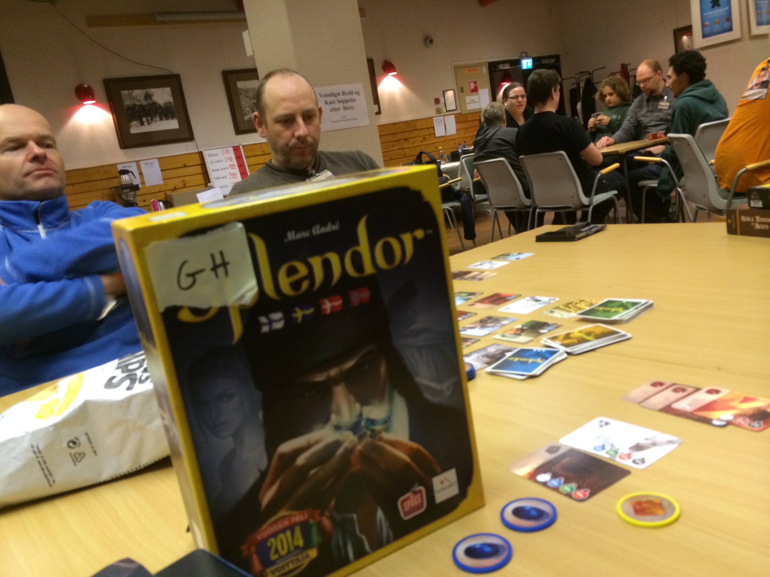 Fire spillere klarte å stille på kort varsel for en ekstra spillaften. Robert kunne romme en en liten gjeng, så for å forebygge kaos ble døren nesten låst da Saulius kom inn som fjerde mann. Saulius hadde slitt med å finne fram og det hadde Pift og Hollender en liten halvtime tidligere også gjort. Men Robert stod som et fyr i gaten for å vise vei. Men da de første to spillere var på plass, ble det startet en en runde Splendor. Robert hadde øvd hele helgen, men det hadde Hollender også gjort tidligere på dagen. I splendor skal man samle edelstener, kjøpe kort og så sanke poeng. Utrolig enkelt, men så gøy! Robert ble så skremt av det