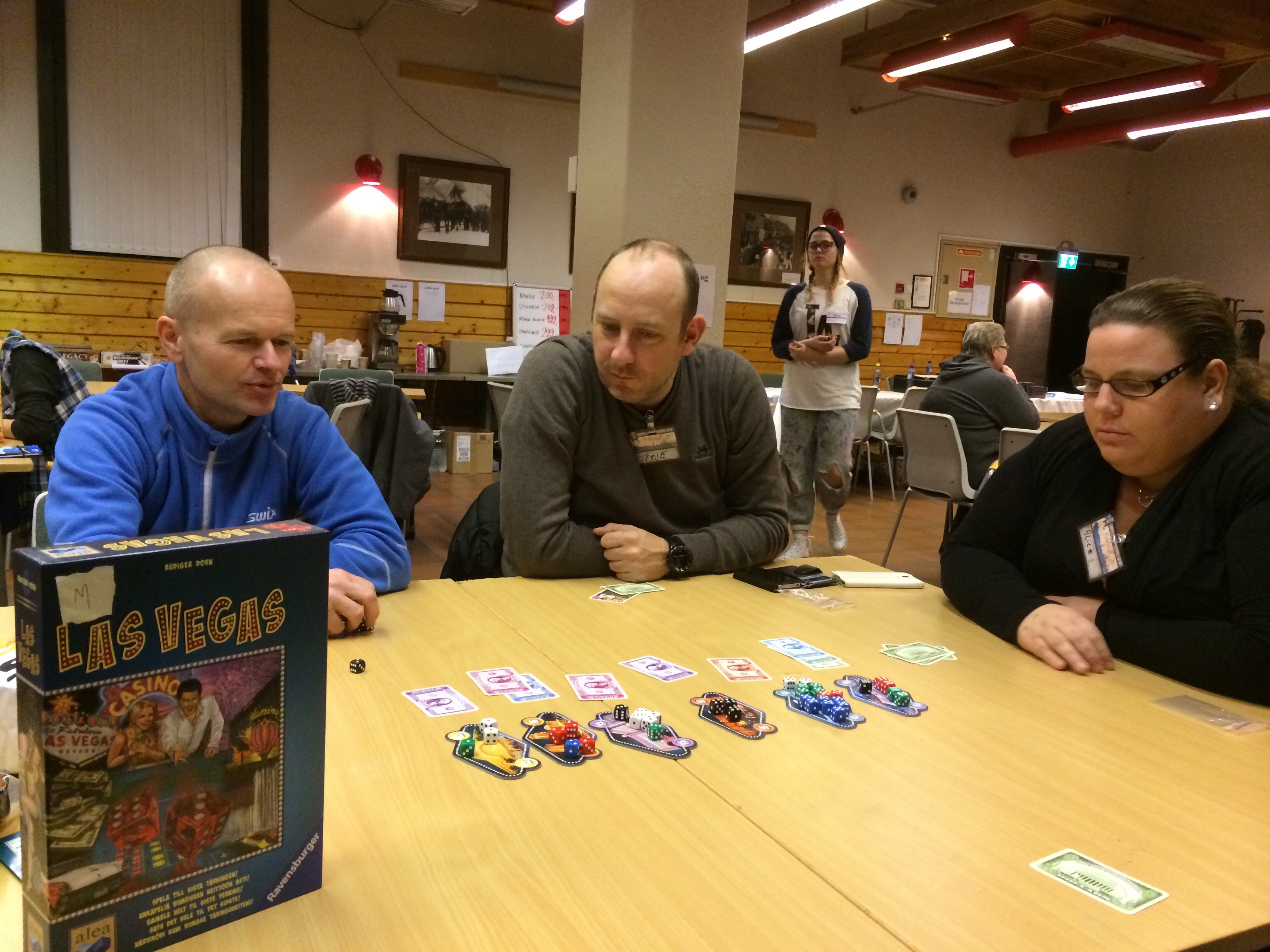 Gutta gikk og kjøpte mat og med kebab tilbake rundt bordet fant Terje ut at en kunne spille Las Vegas og spise kebab samtidig. Alice ble med oss og håper ingen har terninger med kebablukt. Tror vi klarte det godt. 8/10