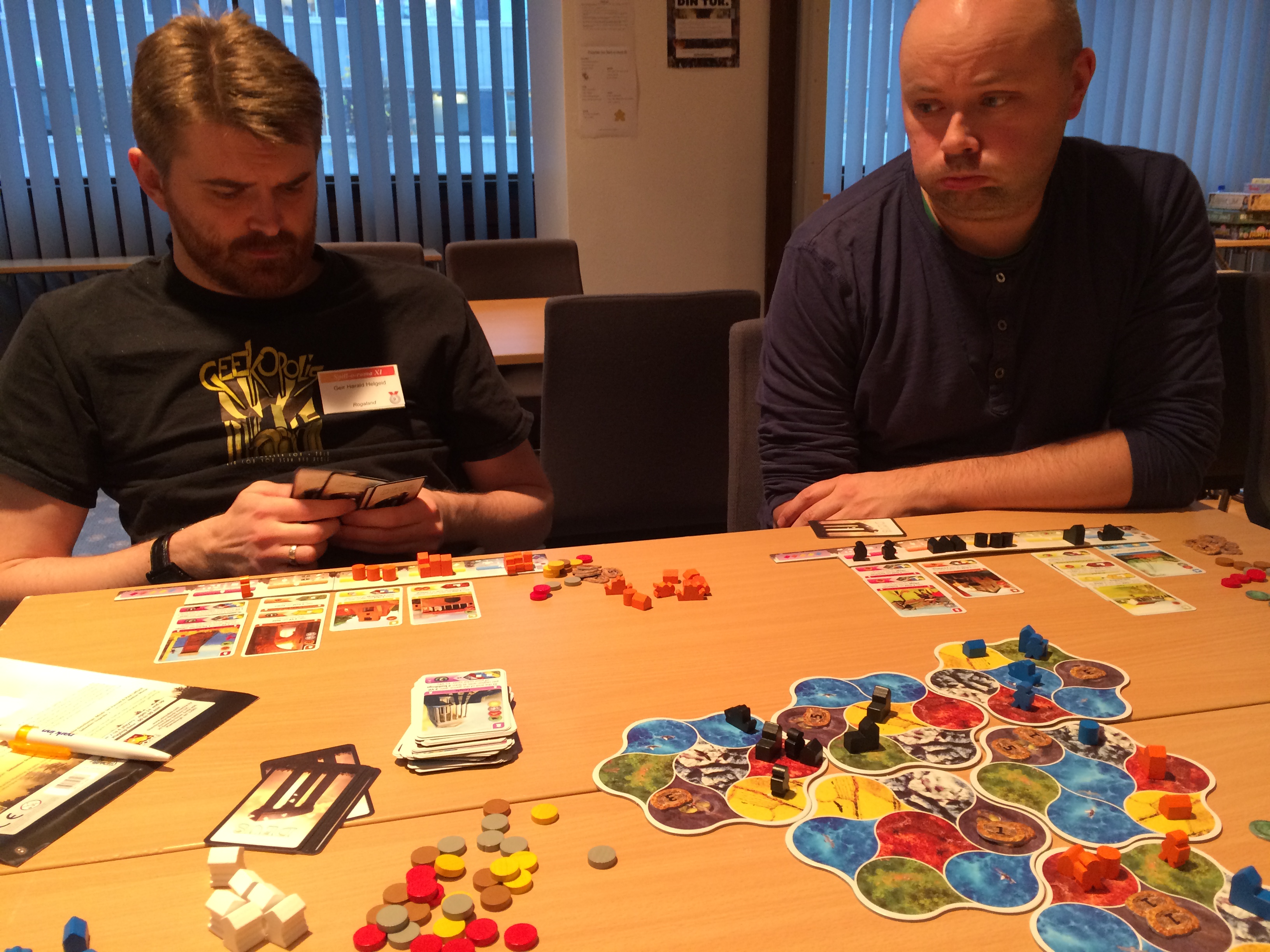 Familien var sendt på ferie, og alt lå til rette for at Sveinmain endelig skulle få tatt turen til SpillOrama. Det var bare å slutte litt tidligere på jobb for å få mest mulig ut av fredagen. Hollender hadde tenkt samme tanke, og derfor tok vi turen sammen over fjorden. Så hvorfor ikke sette i gang det hele med 8 minutes empire, eller Imperium som det også heter. Vet ikke om det tok 8 minutter, men med regelforklaring og oppsett og nedrydning rakk vi 2 runder i løpet av den 35 minutters lange fergeturen fra Tau til Stavanger. Jeg tapte 20-19 begge gangene, men likte spillet såpass at jeg var glad jeg hadde bestilt SpillOramatilbudet som i tillegg til dette spillet inneholdt Citadels og Love Letter. Et meget godt spill i forhold til spilletid. Må jeg velge mellom dette og Hansa Tautonica så velger jeg kanskje dette… Gir spillet 9/10 på skalaen!
