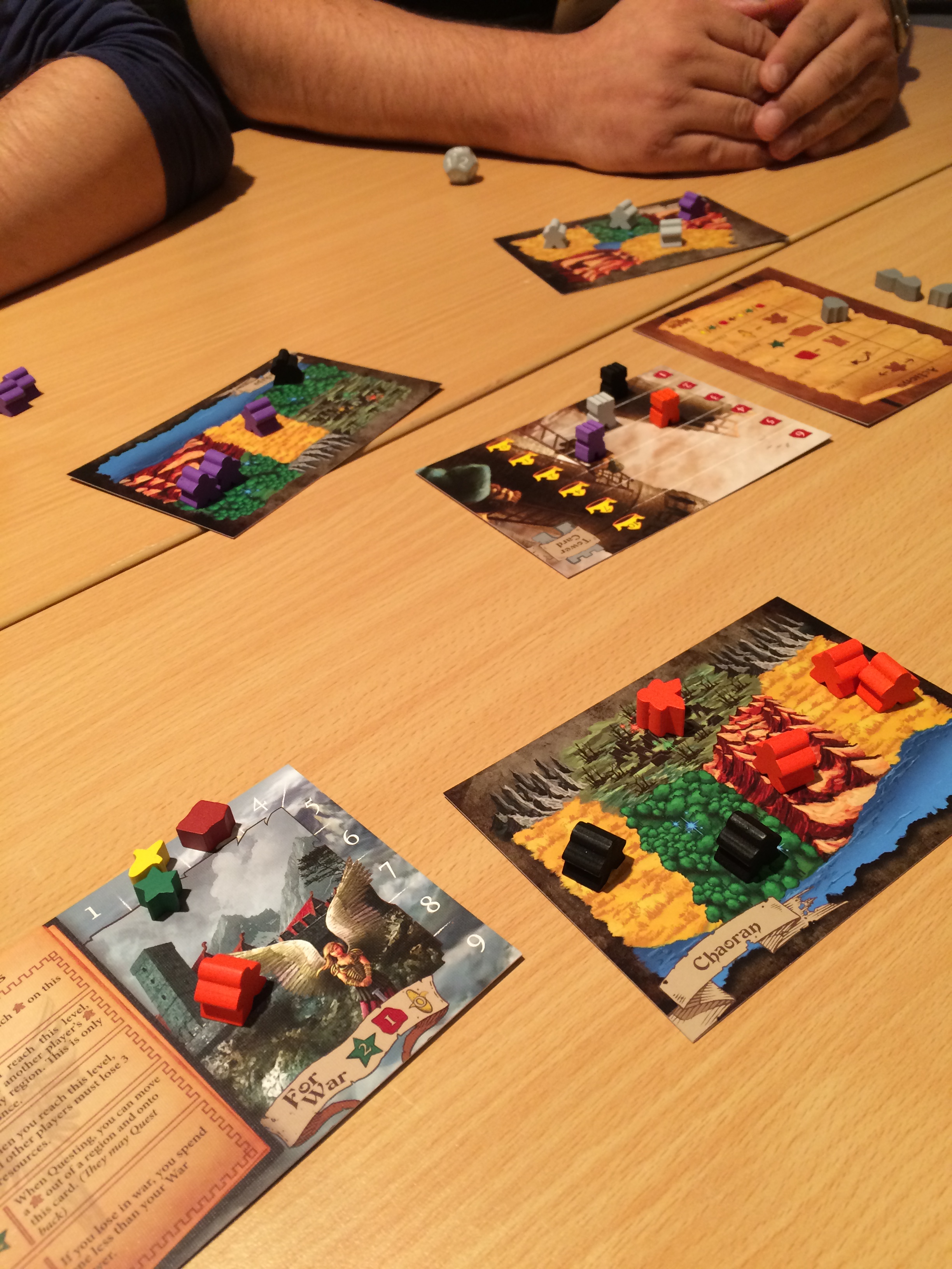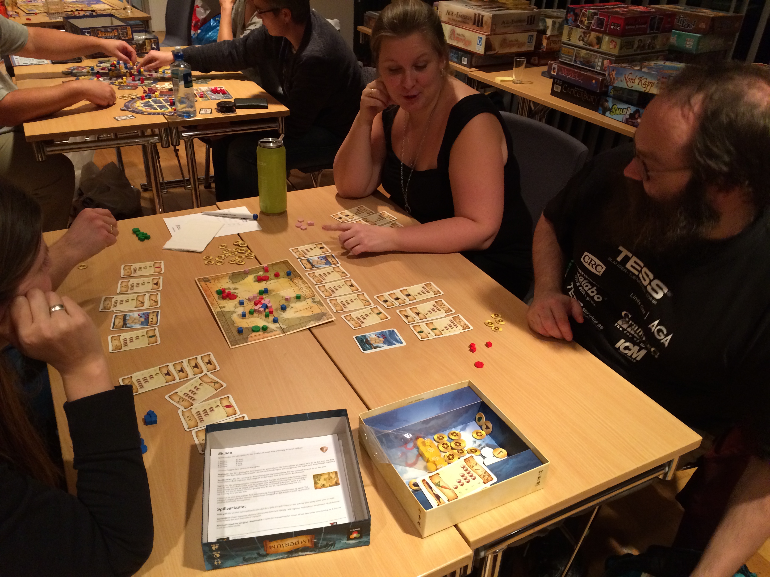 Vel fremme ville vi spille spillet vi hadde bært med oss til Preikestolen – Mangrovia, men måtte vente litt. Dermed ble det Five Tribes som jeg hadde lest reglene på før Preikestolenturen i dag tidlig. Hollender, Elida og Loopin ville være med. I dette Mahjonglignende spillet skal en flytte alle brikker fra ett område og fordele de på de rundt og lande på en med samme farge i som den siste, og deretter utføre en handling ut i fra landingsplass og farge på brikken du flyttet. Det ble mye tenking, fordi ingen kunne planlegge før det var ens tur. Var veldig greit å ha prøvd Five Tribes, men lang spilletid og dårlig spillopplevelse trakk ned. 4/10.