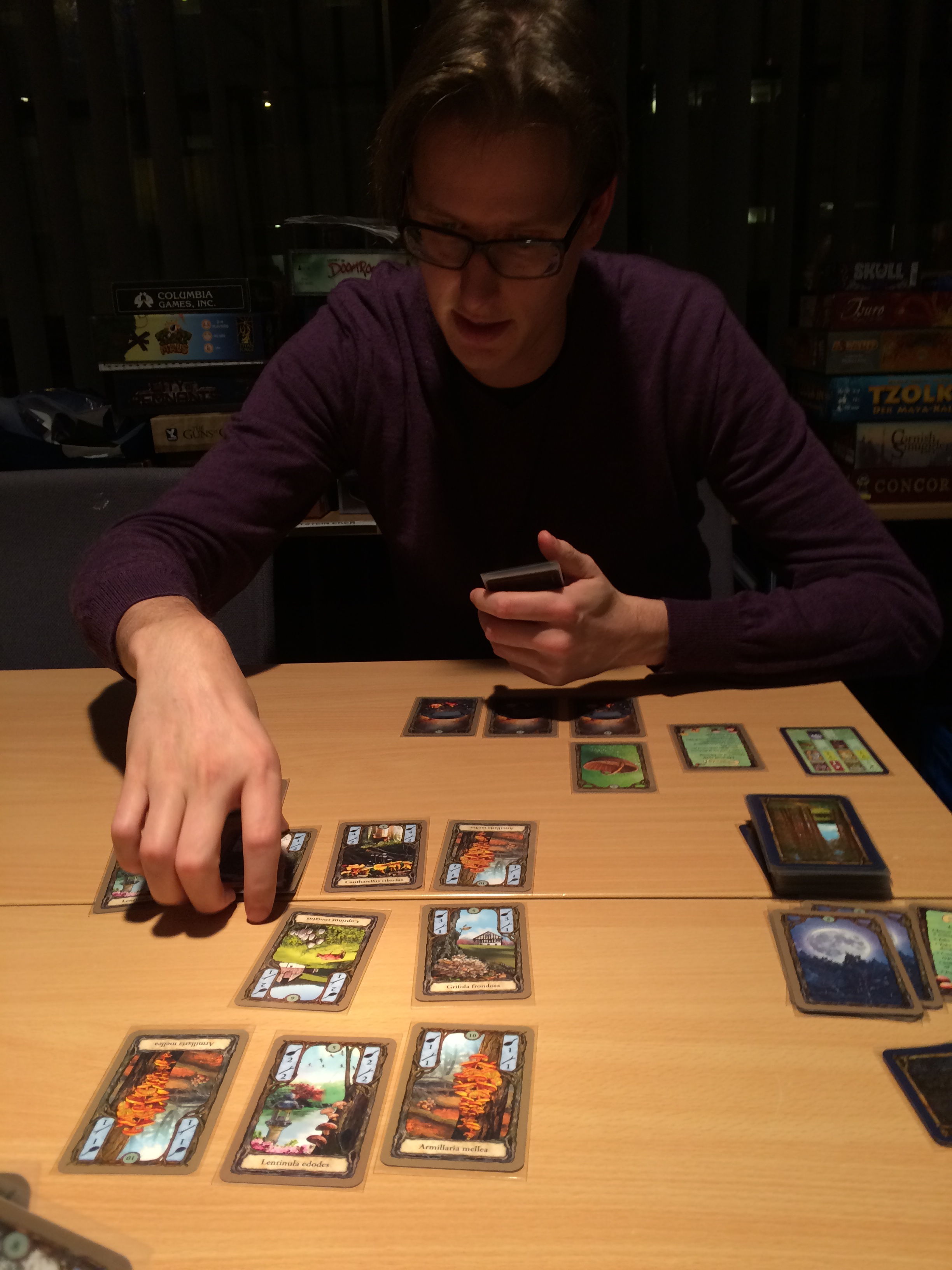 Anja ville også spille Splendor, hvor vi alle er diamantsamlere eller noe slikt. Poenget var i allefall å få tak i billige kort som gav ressurser, men på et eller annet tidspunkt gå for de dyrere kortene som gav mer poeng, men likevel kun en diamant som de billige. Jeg trodde jeg hadde dreisen på dette, men plutselig var Hollender ferdig, og vant soleklart foran oss andre. Helt greit spill i forhold til spilletid. 7/10