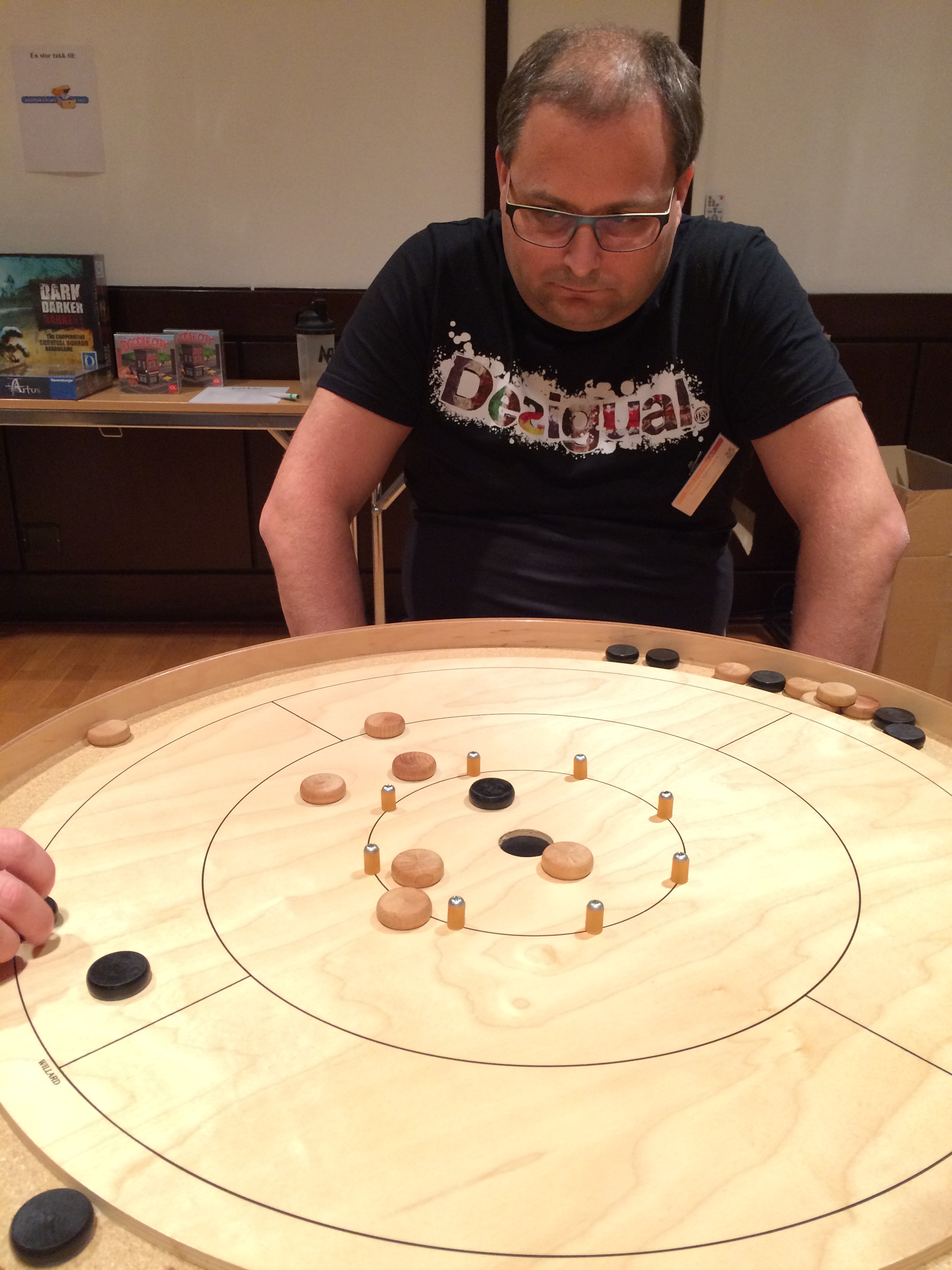 ![]() En gjenganger i de fleste spillmesser er Crokinole. Et elegant spill hvor knipse-ferdighetene jeg har trent på hele året endelig kommer til nytte. Eller, nei, dette har jeg ikke spilt på et år. Av en eller annen grunn ville Espen være på lag med meg. Vi gjorde det veldig godt den første runden og knuste motstanden, men runde to var mye verre. Spillet er absolutt artig å spille, men jeg får fort nok av det. 6/10. |