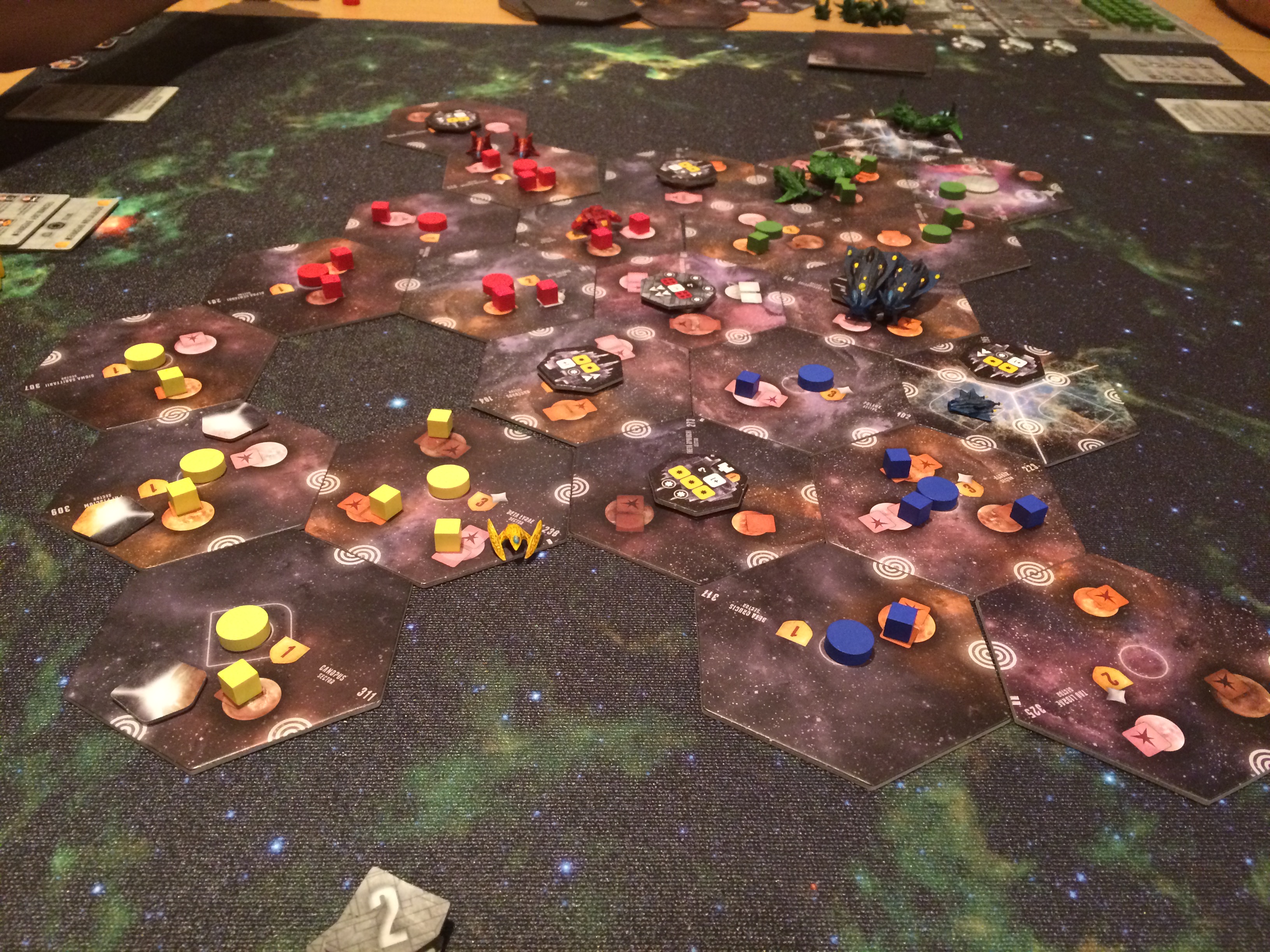 ![]() ![]() Resten av kvelden gikk med på et annet spill. Vel, to spill. Eclipse og Quiz. Jeg lærte opp tre spillere med Eclipse og alle var giret på å komme videre. Reglene satt ikke akkurat som et skudd og mye ble feilforklart og feilspilt. Jeg spiller dette tydeligvis altfor sjeldent. Siden dette var et opplæringsspill så ble mye tilgitt, men neste gang har jeg reglene bedre i fingrene – håper jeg. Det kom veldig mange tilskuere og beundret spillet, spesielt godt siden jeg har en egen stjerne-matte som bakgrunn i et flott materiale, malte ekstra-figurer til spillet og en egen laserkuttet treplate som holdt alle tingene til min rase? Kanskje, bare kanskje. 10/10 |