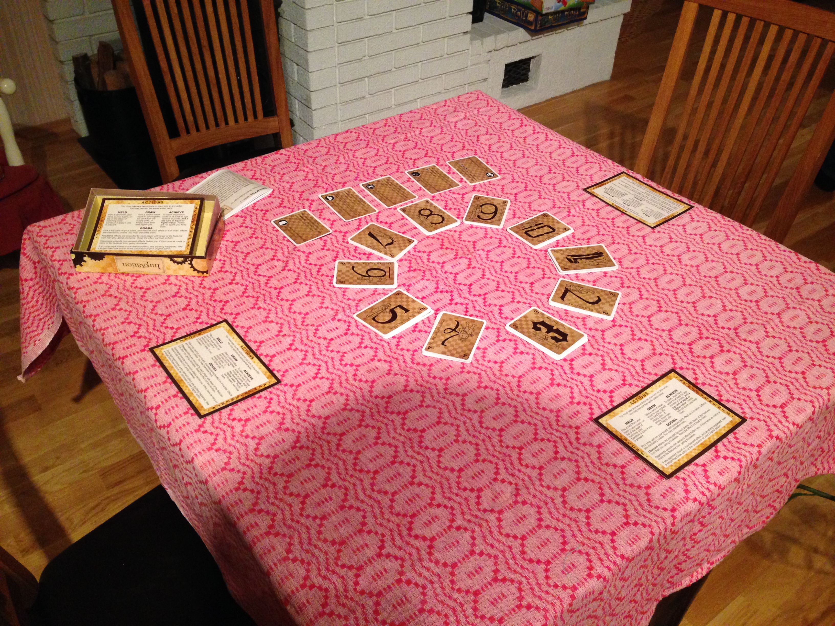 Men vi spilte altså Innovation før andre runde med PG Letter. Dette hadde fått meget lunken mottakelse forrige kveld på grunn av et spesielt kort som gjorde hele opplevelsen ubalansert. Men Peter insisterte og Black Ant lot seg lokke. Takras var ikke veldig interessert, men 3 timer med Age of Empires fristet ikke det heller, med håp om å spille mer enn ett spill denne kvelden. Sekretøsen var i samme båt og ville dra hjem tidligst mulig. Så da fikk Peter viljen, og vi begynte ferden. Heldigvis hadde Black Ant spilt det før og kunne forklare reglene systematisk. Flyten i spillet var lett å komme inn i, men det er mange tilfeldigheter i spill som kan påvirke fremtidige valg. Det lønner seg å være forsiktig når man «melder» tilfeldige kort.