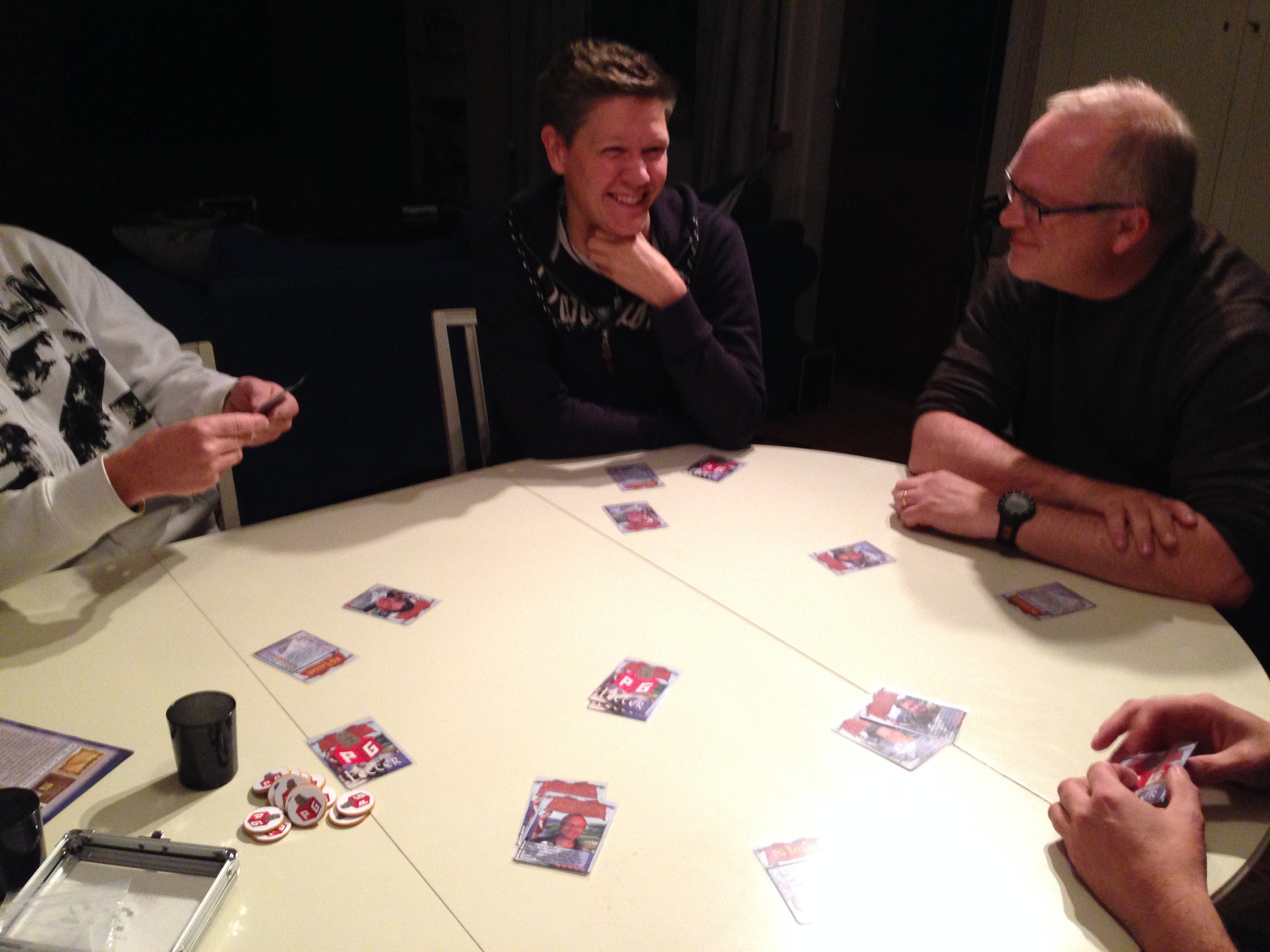 En runde med PG Letter førte til mye latter. Egentlig beregnet for 4 spillere så funker det fint med 5 også. Bare at trekkbunken gjerne går tom fort. Det er ekstra god latter når Skillz benytter Kim til å kaste seg selv ut. Litt uberegnelig gjort av ham. Temaet passet som fot i hose, hva nå enn den analogien betyr. Takras stakk av med nesten alle poeng forrige gang, men denne gangen ble det hele 0 poeng på ham. Til og med Skillz fikk et poeng denne gangen. Peter prøvde å finte med å spørre Black Ant etter Geeken, men Geeken var tilstede og anklaget Peter for selv å sitte med Geeken. Busted!