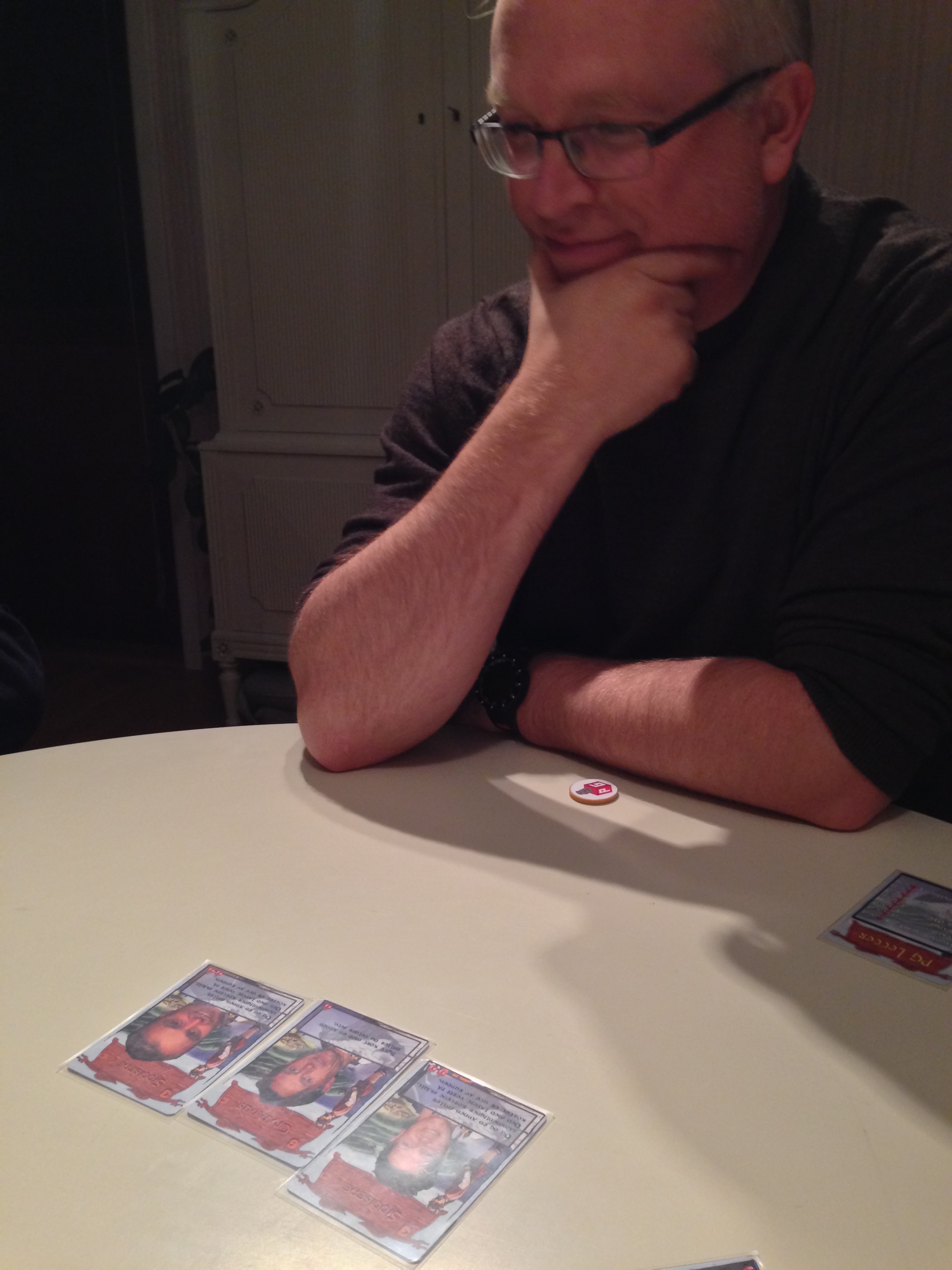 Andre runde med PG Letter ble på et annet bord, etter at Innovation ble slaktet. Denne gangen var en av siddisene byttet ut med selveste Saunaprinsessa. Vi tenkte bare å begynne å spille en runde og forklare henne hvordan det foregikk. Men da hun så på kortet sitt ble det sinnsykt opplagt hvilket kort hun trakk: seg selv. Så vi delte ut på nytt.