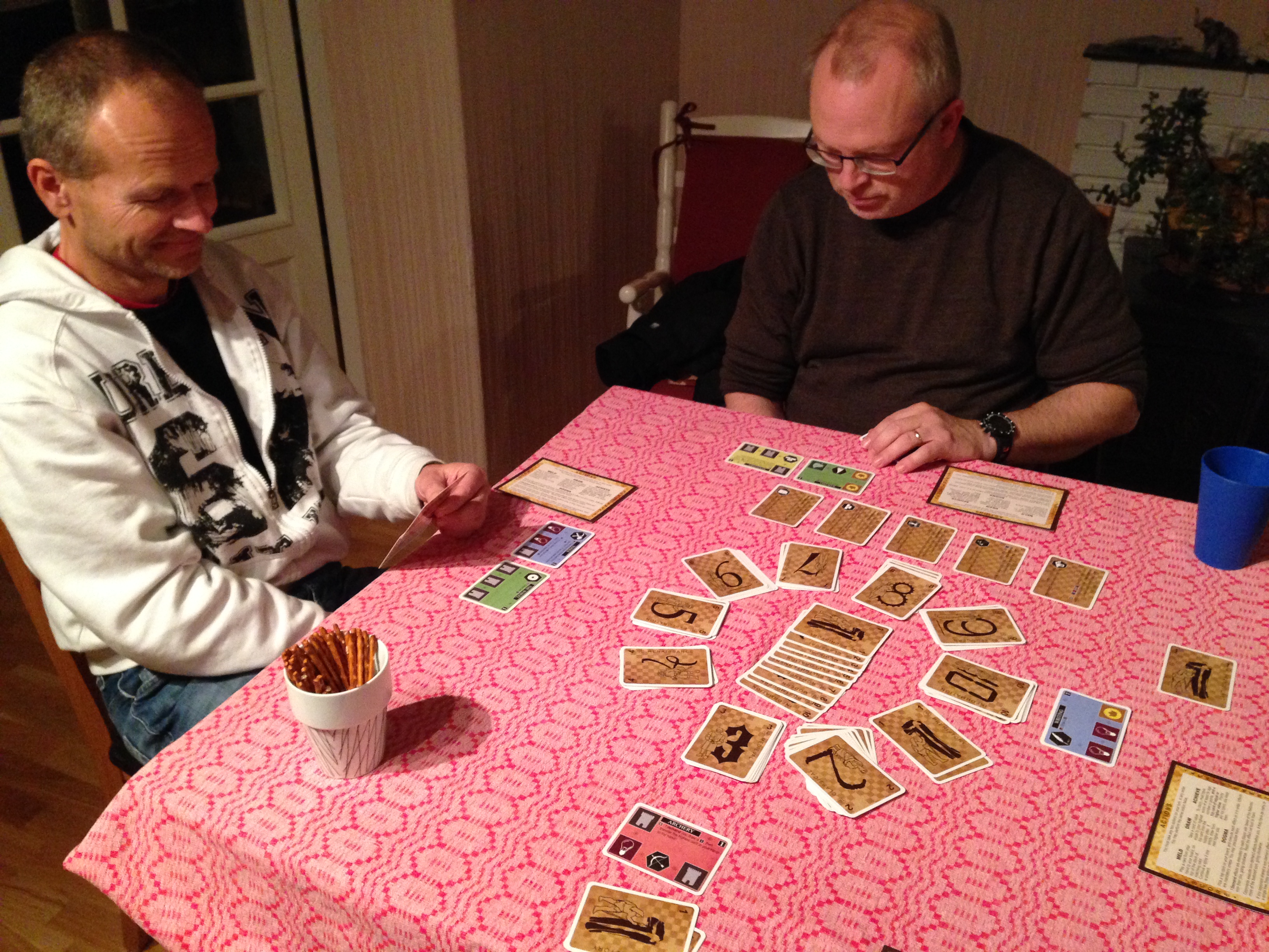 På det andre bordet hadde Hollender forklart Trajan til Pift og Marog. Marog viste raskt at regelforklaringer var god og viste mye godt planlegging med skålene sine. Pift valgt