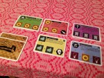 Glass Roads. Tross Uwe Rosenberg så ble jeg med på dette. Det hadde noen hjul som minnet om Inland Port, så kanskje det ikke var så galt? Men spillet hadde en helt annen funksjon enn sine andre i harvest-serien. Vi har en bunke med handlingskort hver, men må velge ut 5 av dem. Vi kan så spille ut et kort samtidig med andre. Hvis noen har spilt et kort som du har på hånd, så får du gjort det kortet også, men kanskje til feil rekkefølge. Hvis andre har spilt ut det kortet du la ut, så får de gjøre det samme. Men det fungerer bare to ganger per runde. Hvis du er alene om et kort så får du gjort begge handlingene på kortet. Så du vil være alene når du spiller ut kort selv, men ikke når andre spiller ut sine. En artig mekanisme, men som ledet til en god del tenking. Spesielt med mange tilgjengelige bygg på brettet. En annen snedig mekanisme var ressurshjulene. Hvis du ikke hadde 0 av en var igjen, så oppgraderte du glass eller mur, avhengig av hjul du var på. Da hadde du plutselig 0 igjen likevel, gjerne i en ressurs du skulle bruke sammen med det nye glasset. Litt vanskelig å bli vant med, men det fungerte. Dette var vel en av helgens minst gledelige nyhet. Det hadde interessante mekanismer, men det var ikke noe for meg.