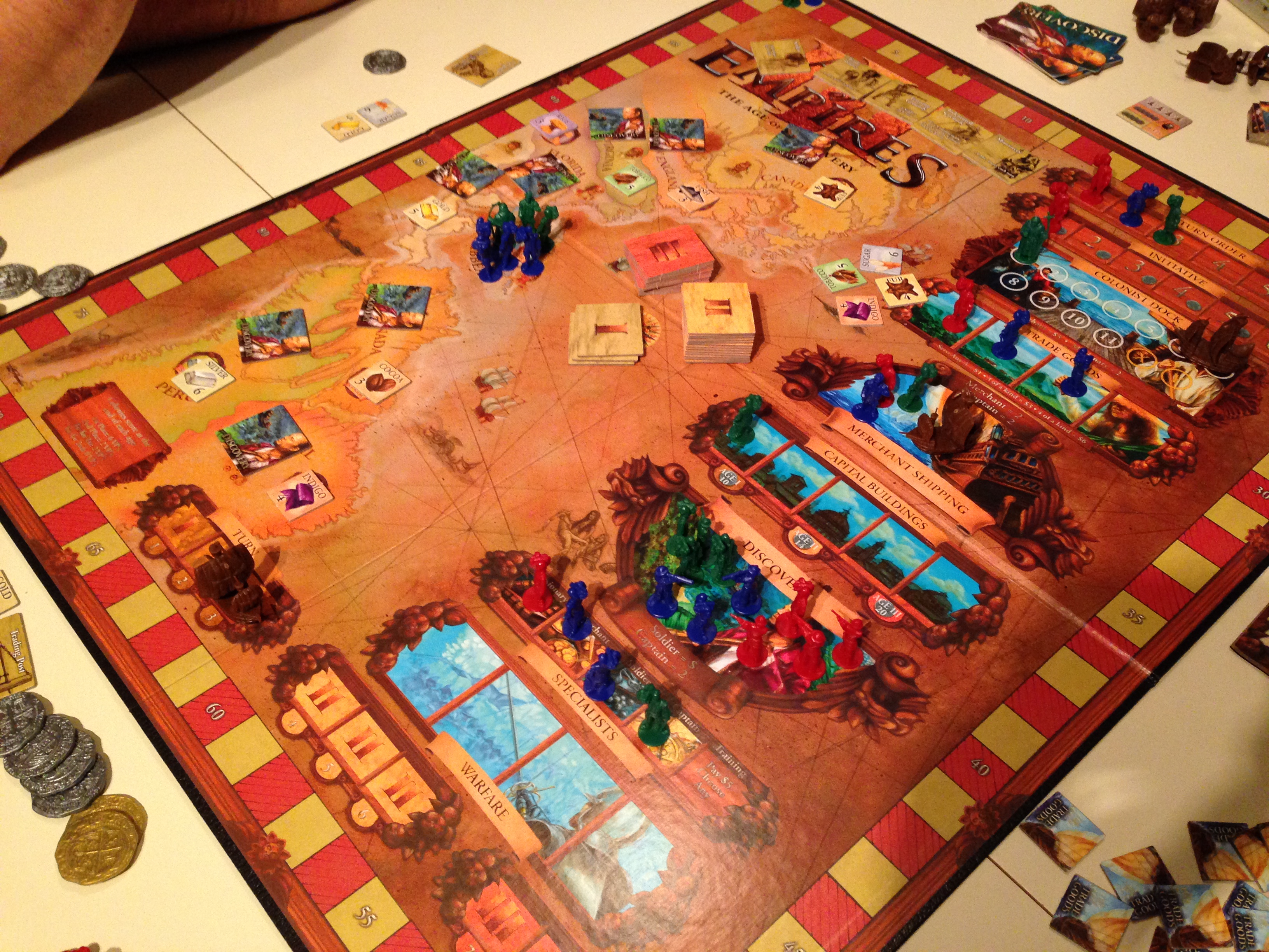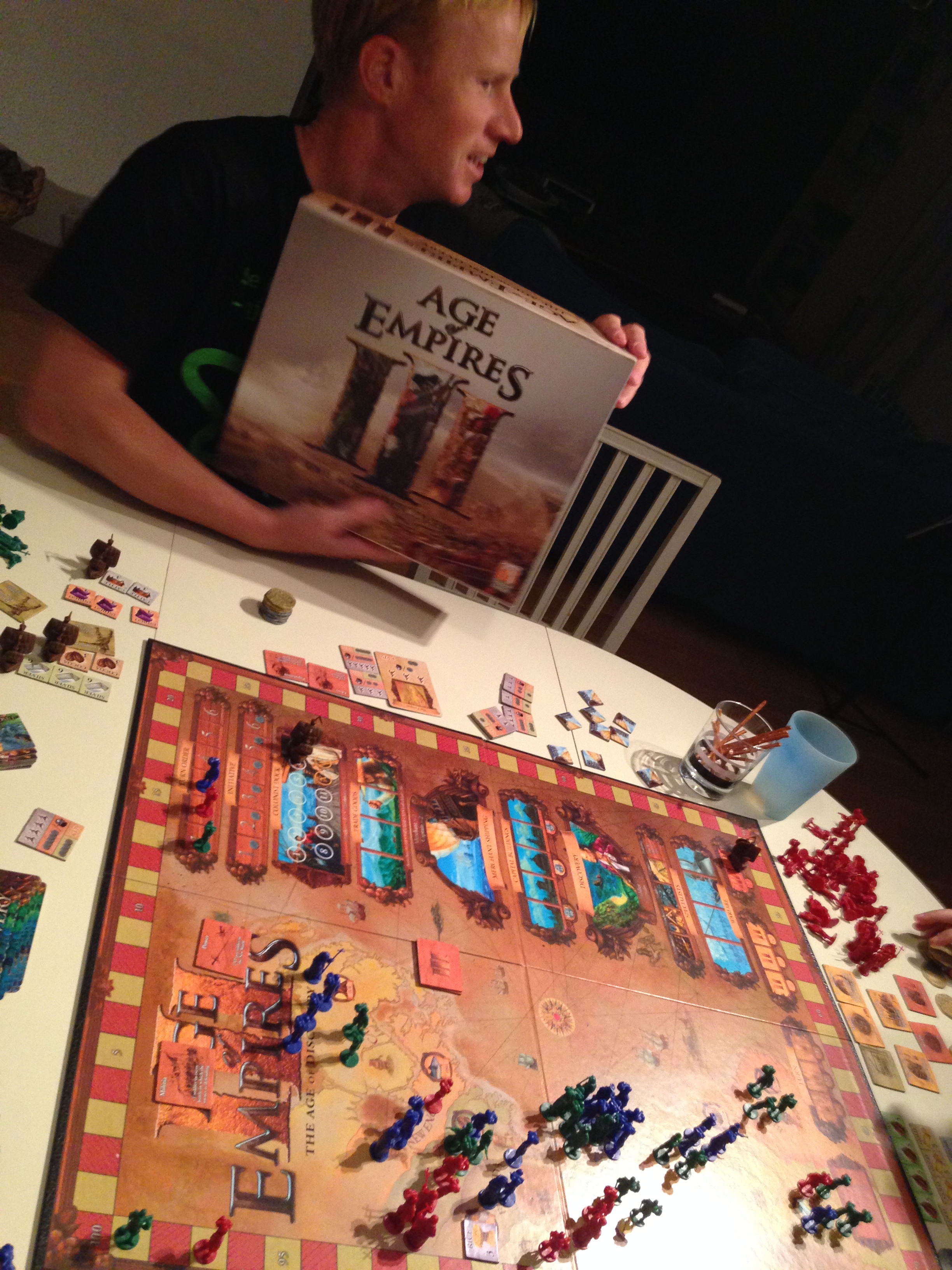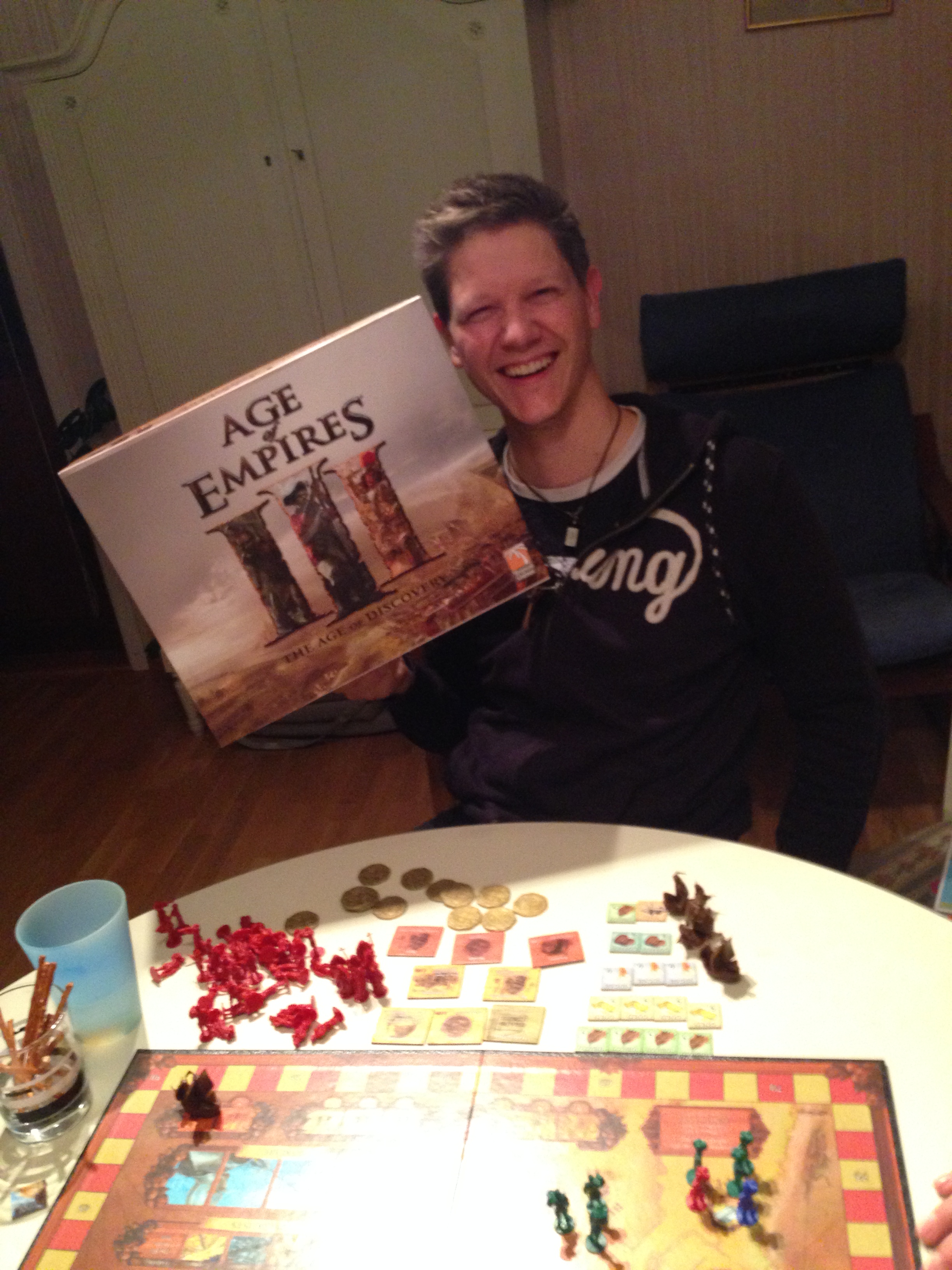 Skillz hadde bestilt en runde Age of Empires III, og Sveinmain tok med spillet selv om reglene var litt rustne, så ble Kim med og vi var i gang. I dette Worker Placement spillet skal en sette ut folk i startrekkefølgen, til å reise(til karibien til å begynne med), skaffe varer som igjen gir penger, Skaffe seg skip som igjen gir penger(et pr. runde) skaffe seg folk til neste runde i form av misjonærer, soldater, handelsmenn eller kapteiner. Dra på eksedisjon. Bruke penger på å skaffe seg fordeler hver runde. Krige mot de andre hvis du har soldater i amerika selvsagt.